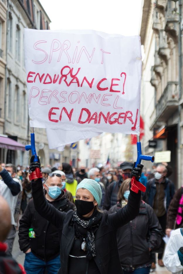 In the main streets of Besançon, on Saturday 7 November, 600 people demonstrated to denounce both the break-up of the public service, the lack of resources invested in the hospital after the first wave, and the measures taken by the government to deal with the return of the virus.
