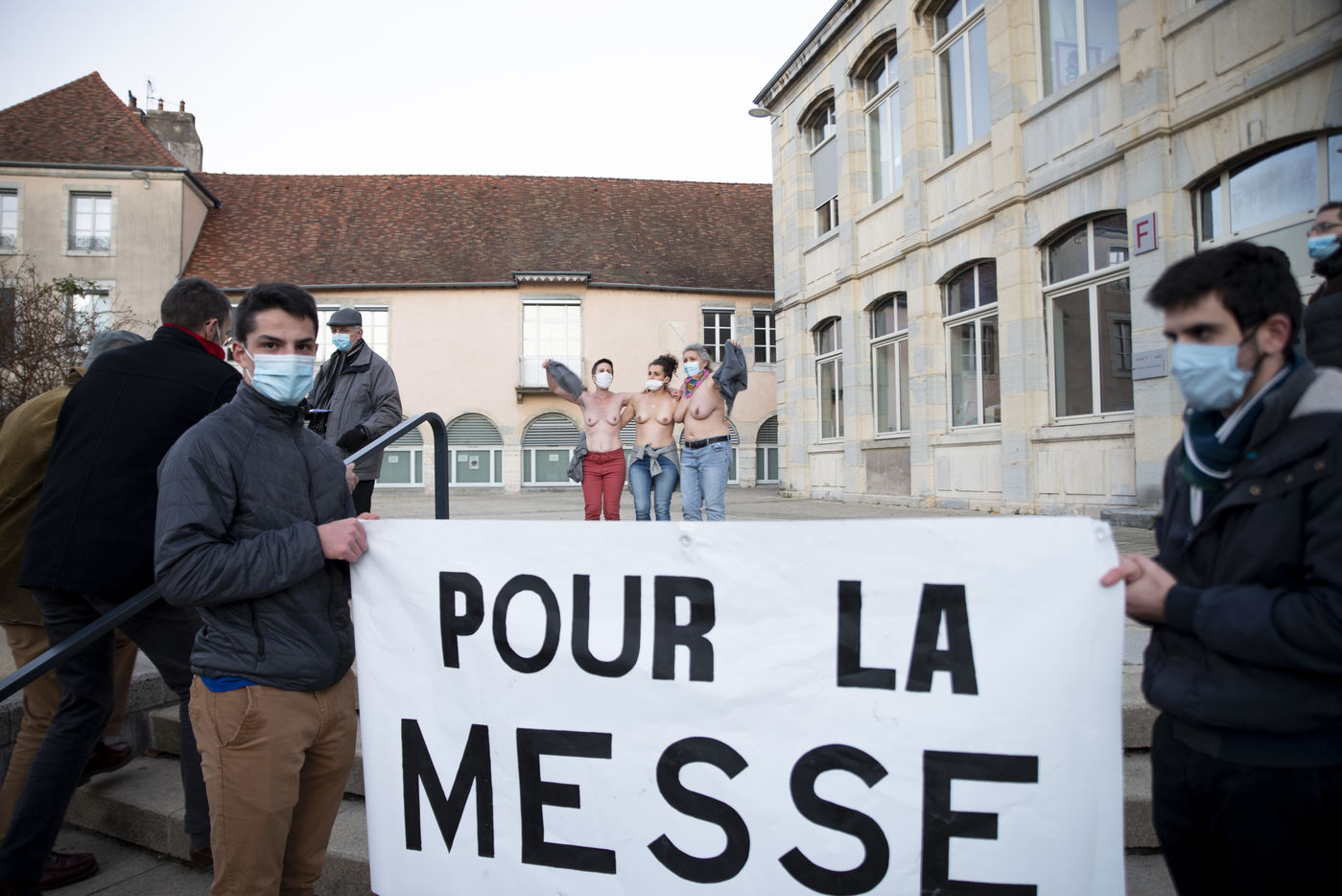 The rally was on the return journey from the two previous demonstrations. Spirits were stirring, some demonstrators disturbed the good conduct of the prayer with songs and slogans claiming the laicity of the public space. After several minutes, three women, shirtless, appear behind the banner "For Mass" facing the sixty or so Catholics.
