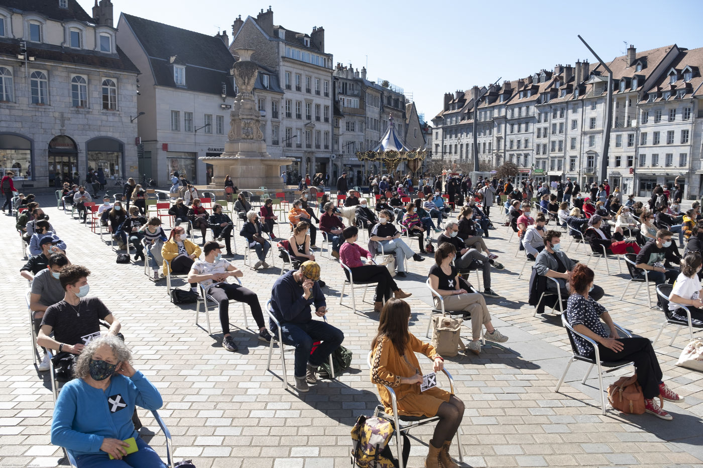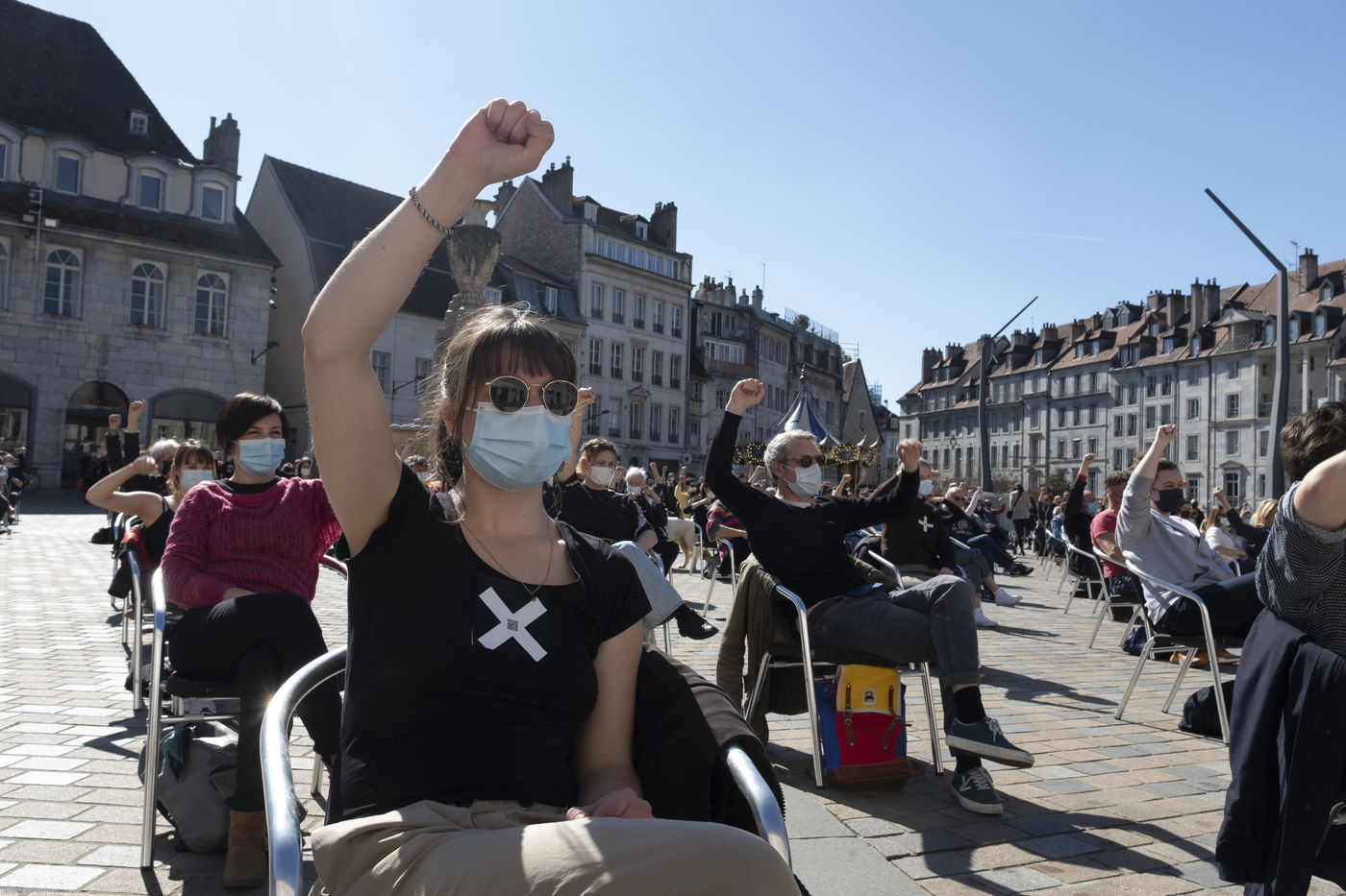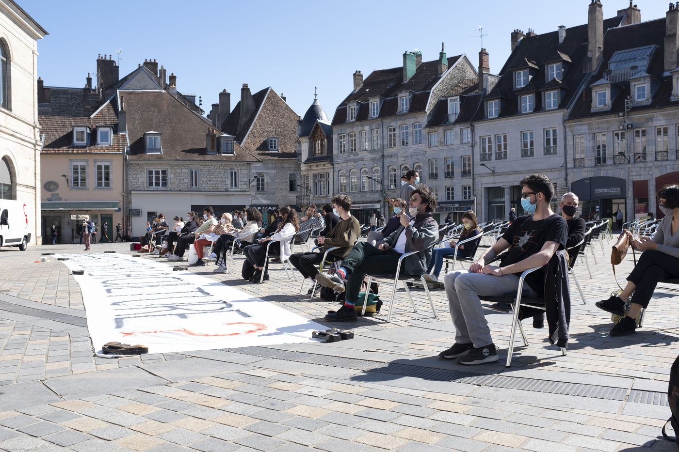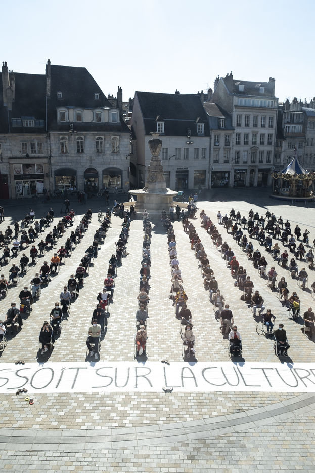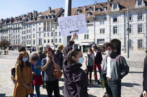 Every day at 2pm an agora is held in front of the theatre. Multiple actions have already taken place. After the installation of numerous banners throughout the city, a large festive and protest rally on 21 March at the Cité des Arts, the CIP FC (Coordination de Intermittents et Précaires de Franche Comté), the DNMADE section of the Pasteur high school and the CGT spectacle organised a flash action at the Place de la Révolution.