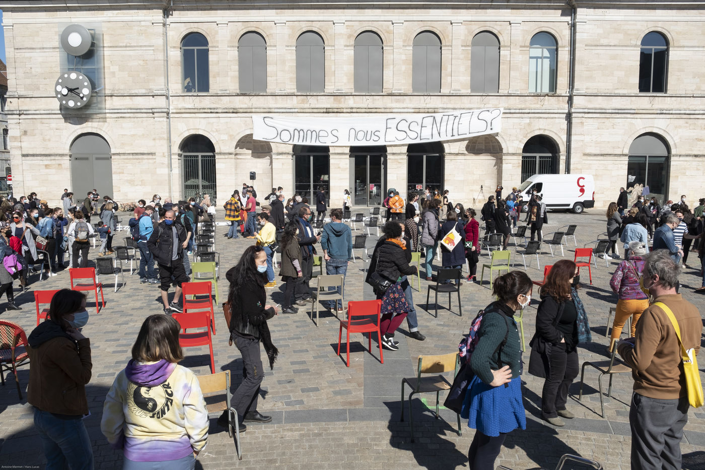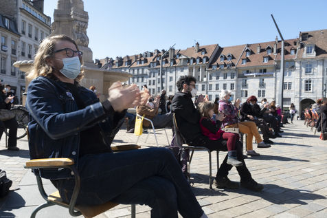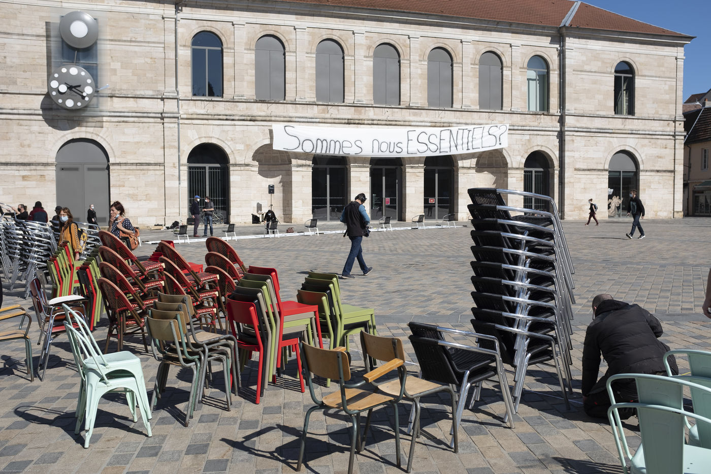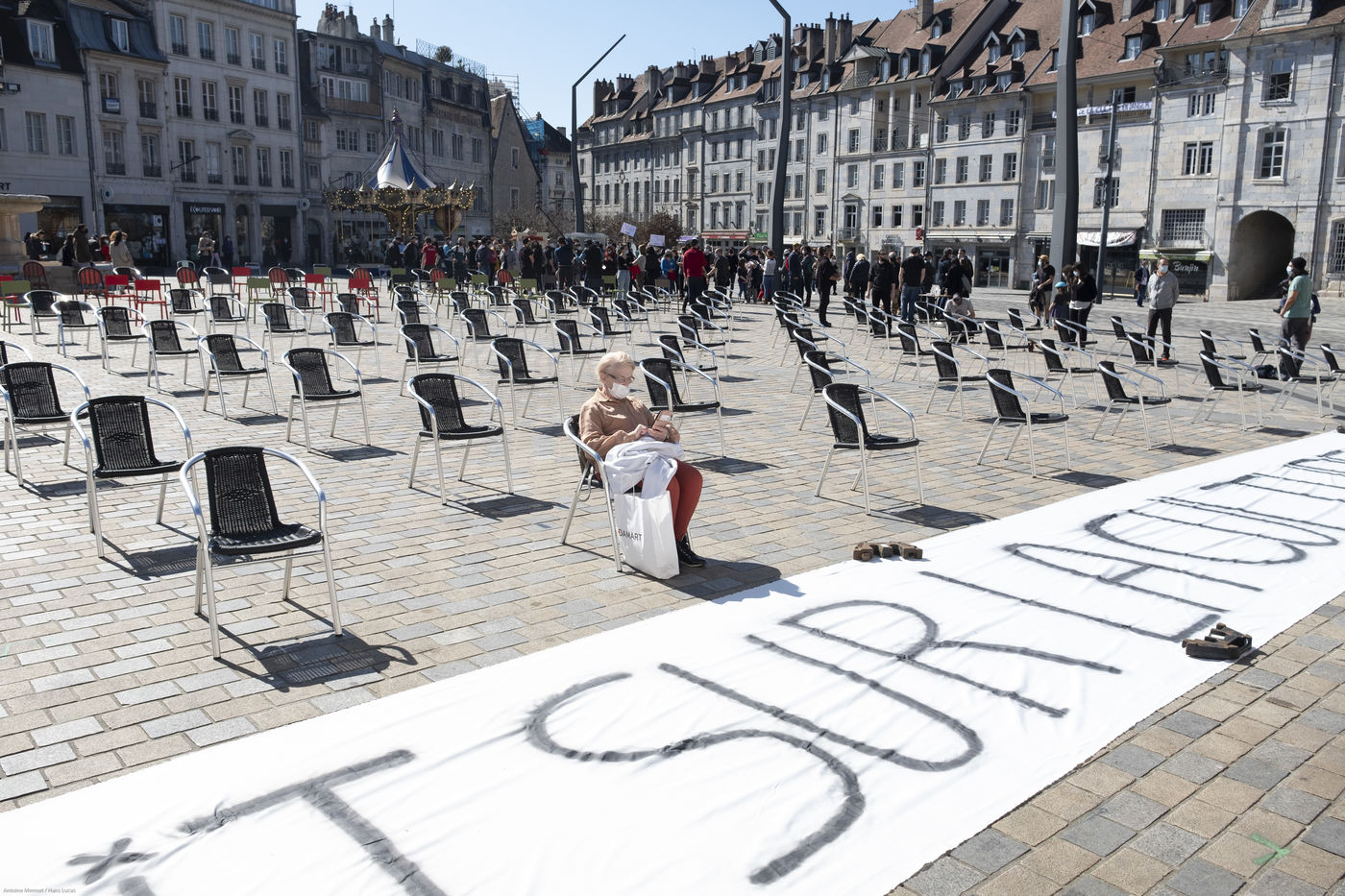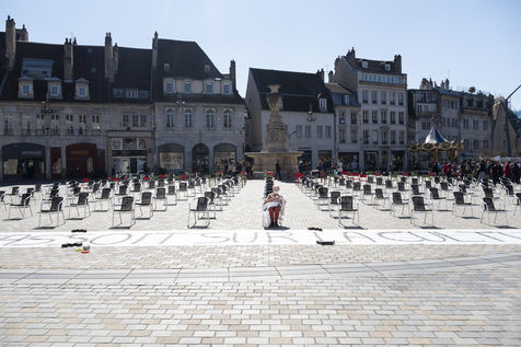 Every day at 2pm an agora is held in front of the theatre. Multiple actions have already taken place. After the installation of numerous banners throughout the city, a large festive and protest rally on 21 March at the Cité des Arts, the CIP FC (Coordination de Intermittents et Précaires de Franche Comté), the DNMADE section of the Pasteur high school and the CGT spectacle organised a flash action at the Place de la Révolution.