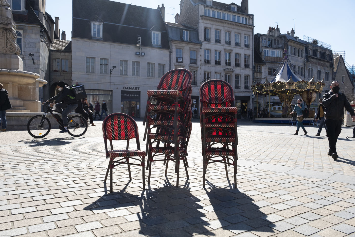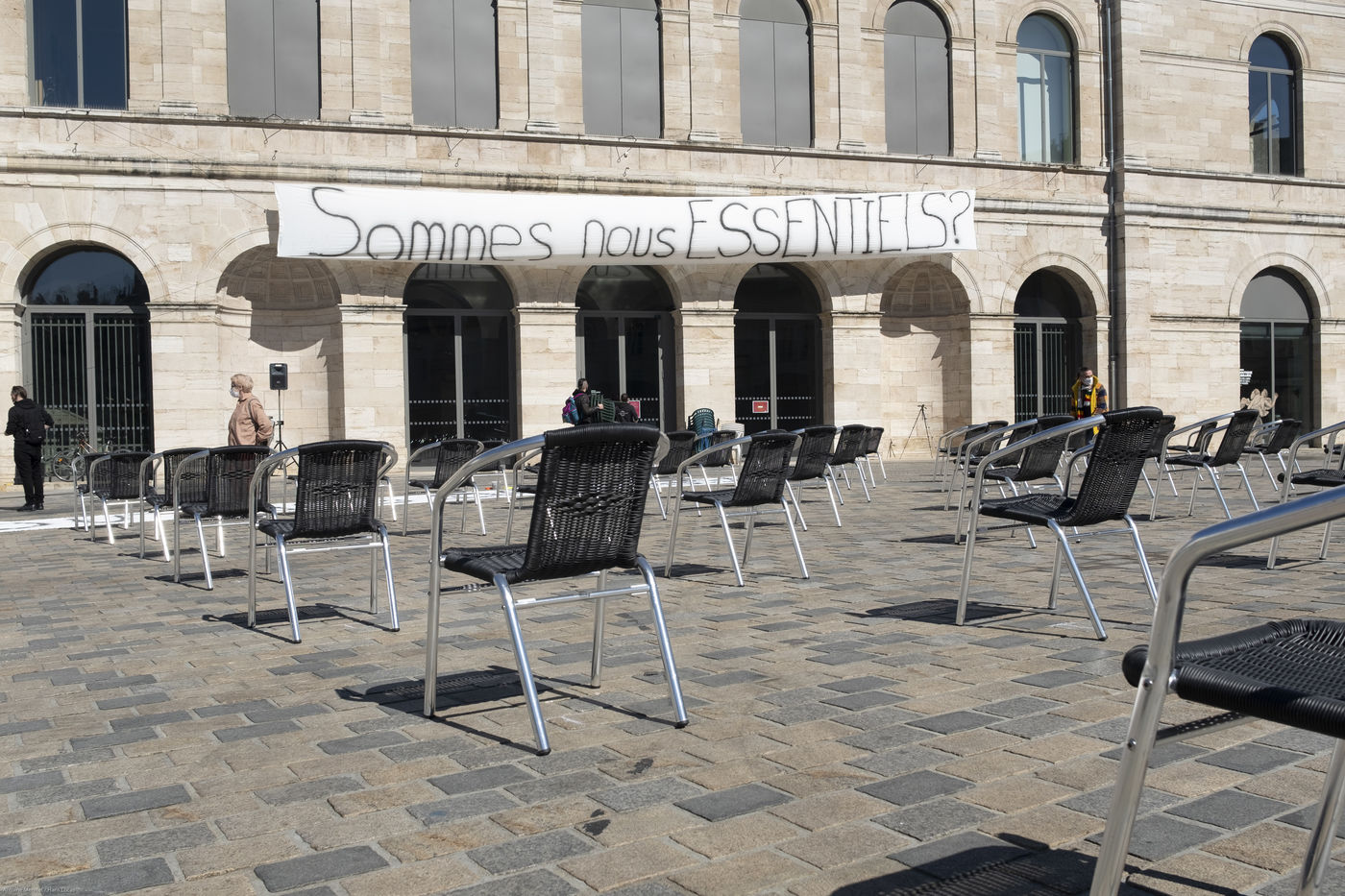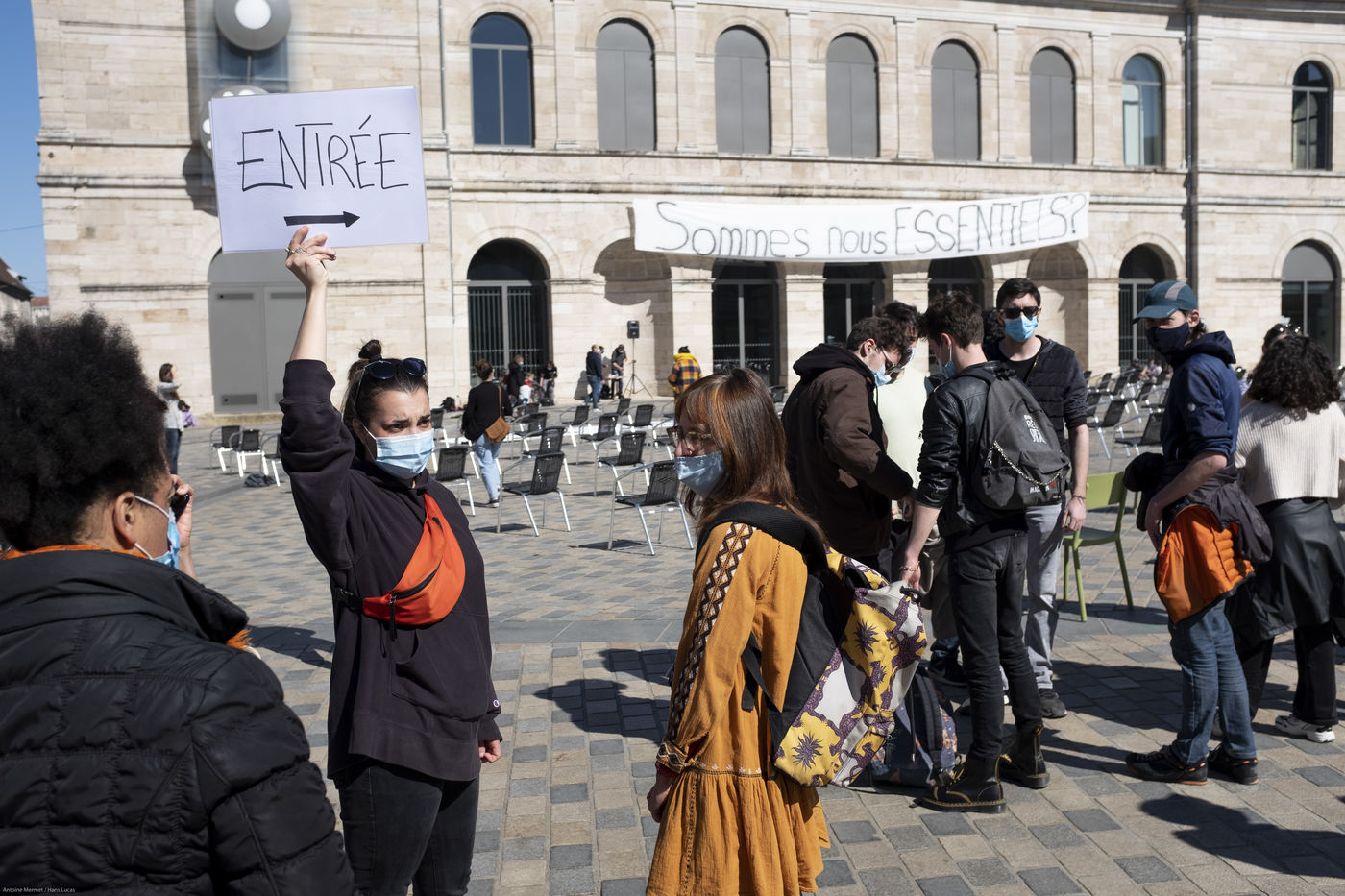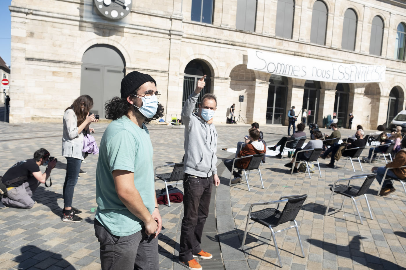 Every day at 2pm an agora is held in front of the theatre. Multiple actions have already taken place. After the installation of numerous banners throughout the city, a large festive and protest rally on 21 March at the Cité des Arts, the CIP FC (Coordination de Intermittents et Précaires de Franche Comté), the DNMADE section of the Pasteur high school and the CGT spectacle organised a flash action at the Place de la Révolution.
