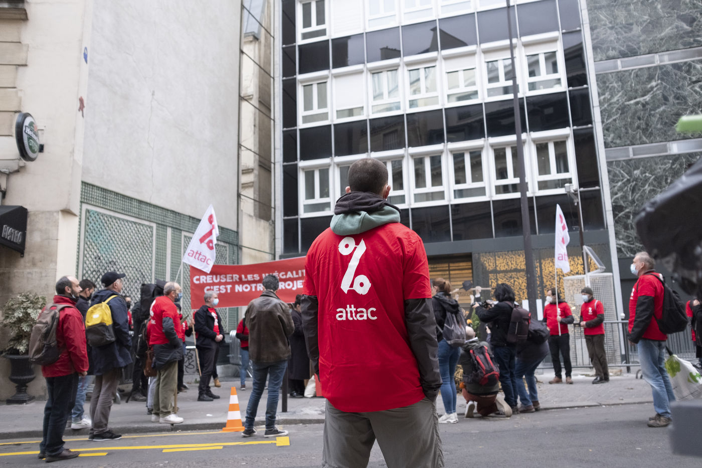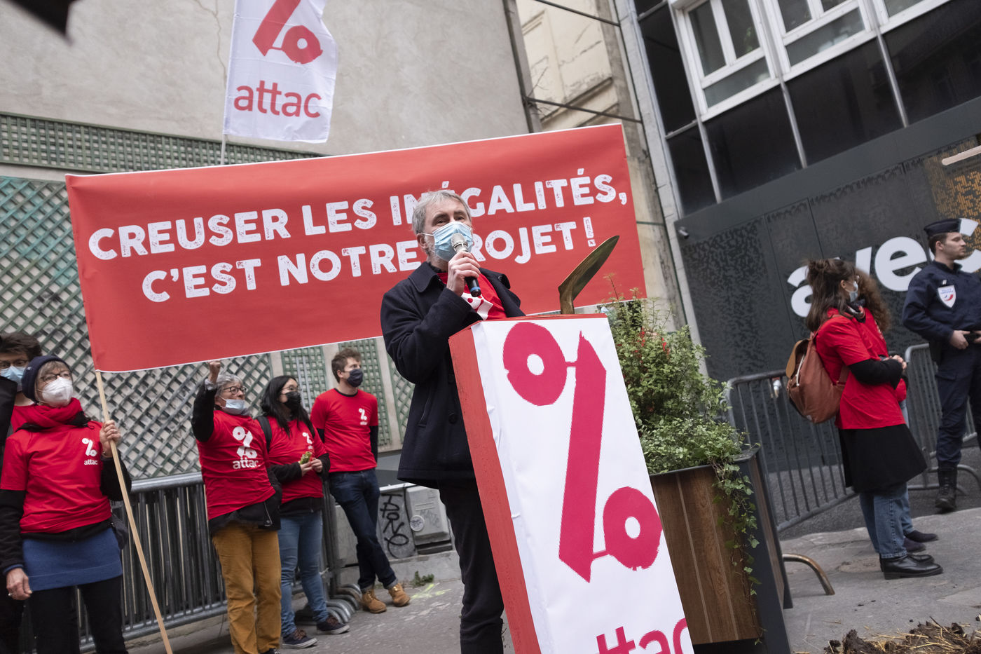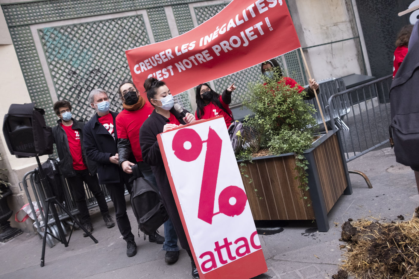Devant le siège de LREM, rue du Rocher dans le 8eme arrondissement, des militantes et militants de l'association Attac ont organisé une action éclaire dans le cadre de la sortie de leur nouveau rapport