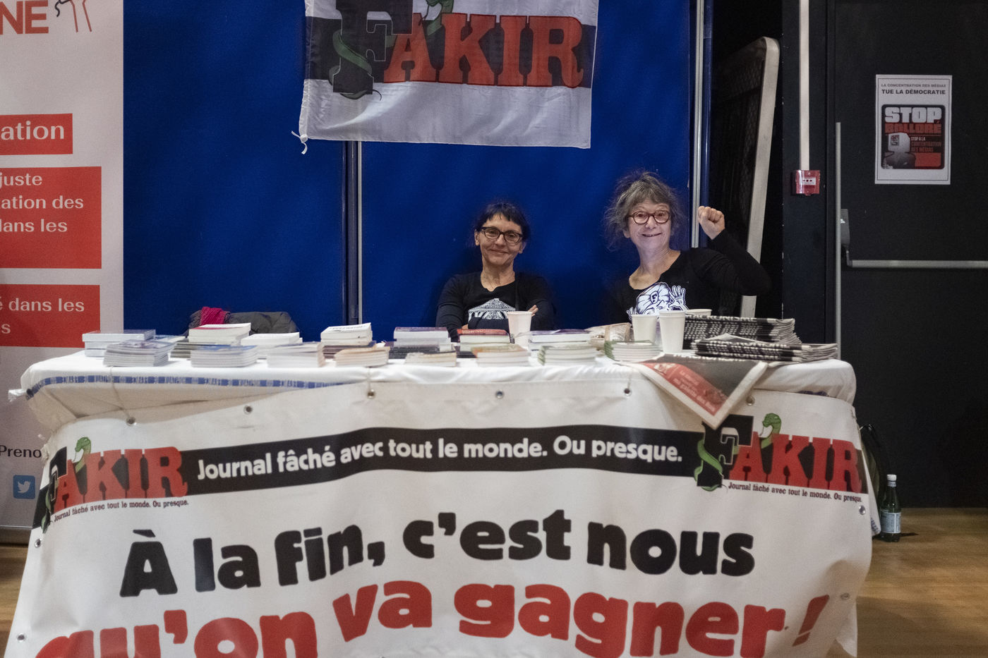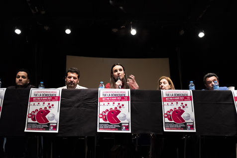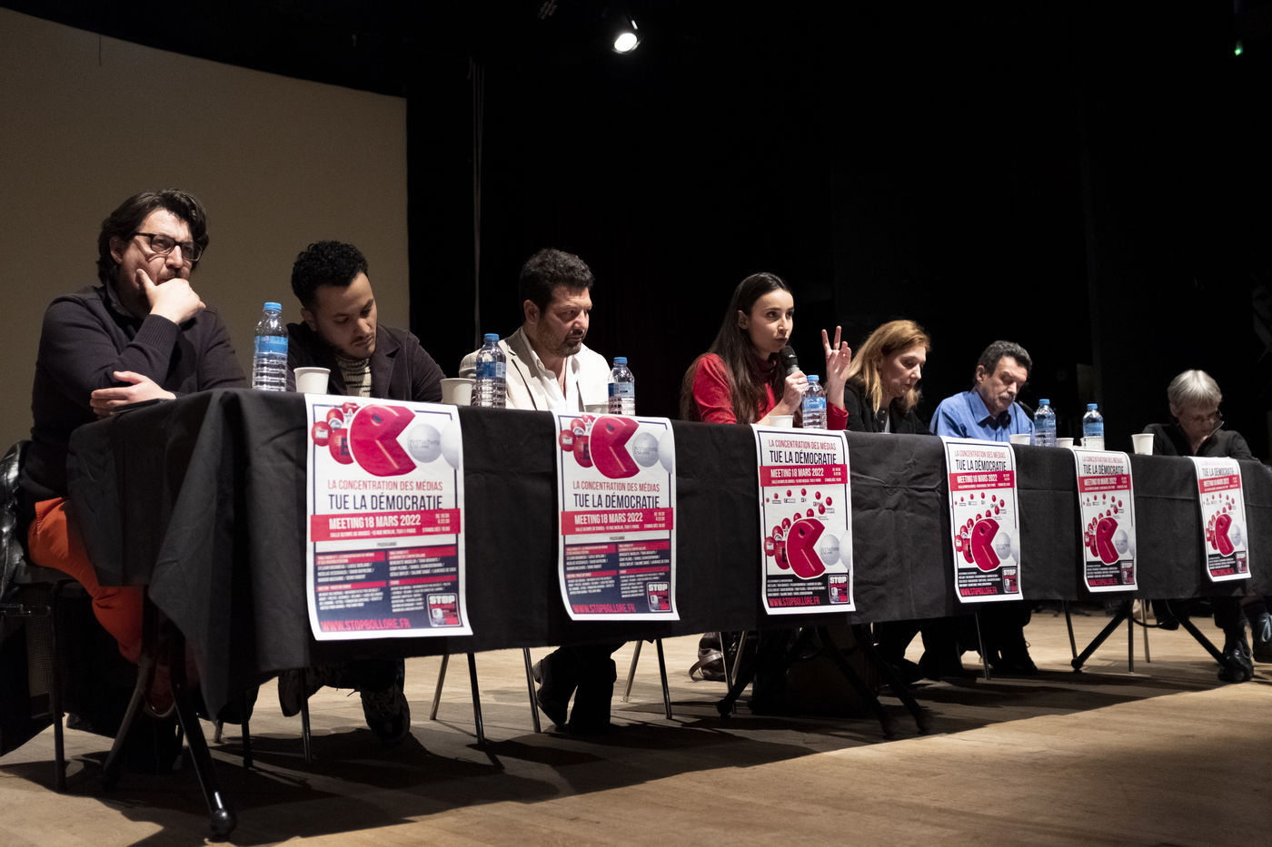 La première autour de Lucile Berland, Denis Robert, Marion Mazauric, Daniel Schneidermann, Sylvain Bourmeau, Nicolas Vescovacci, Jean-Baptiste Rivoire.