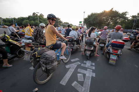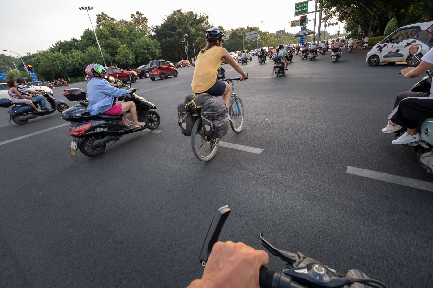 Nous avons décidé de parcourir la Chine à vélo. Dans l'imaginaire collectif, le vélo est omniprésent en Chine, mais il en est rien aujourd'hui. Le scooter a depuis bien longtemps remplacé le vélo. Nous sommes passé par des villes où nous nous sentions bien seuls sur les pistes cyclables envahis de deux roues motorisées.