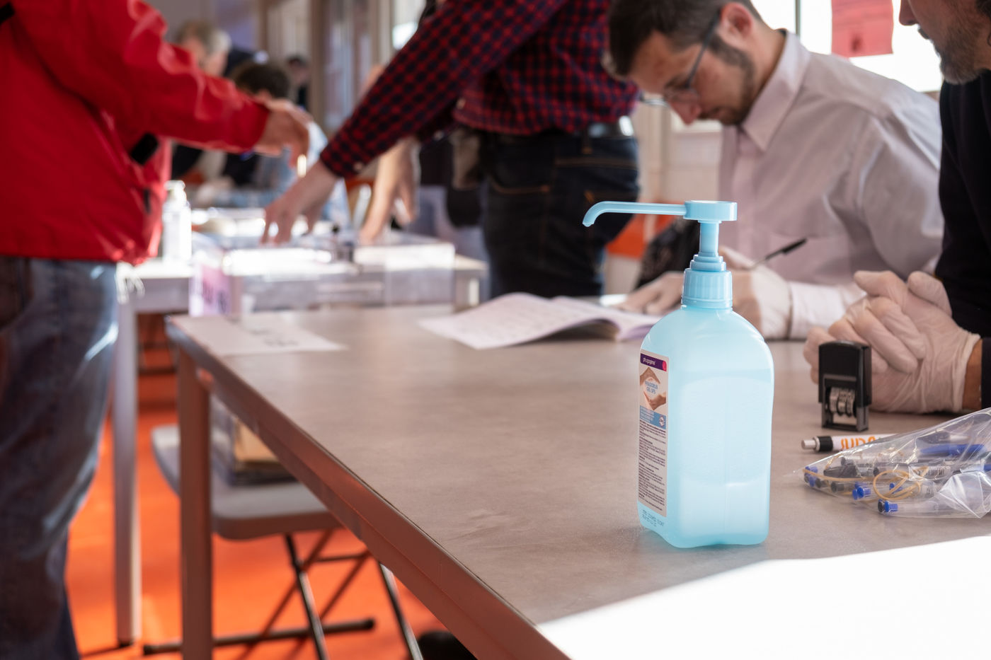 Le premier tour des élections municipales a lieu pendant l'épidémie de coronavirus. Gants, masques et gel hydroalcoolique sont la particularité de ces elections. Il n'est pas facile d'obliger les gens à garder leurs distances de sécurite. Toulouse, 15 mars 2020.