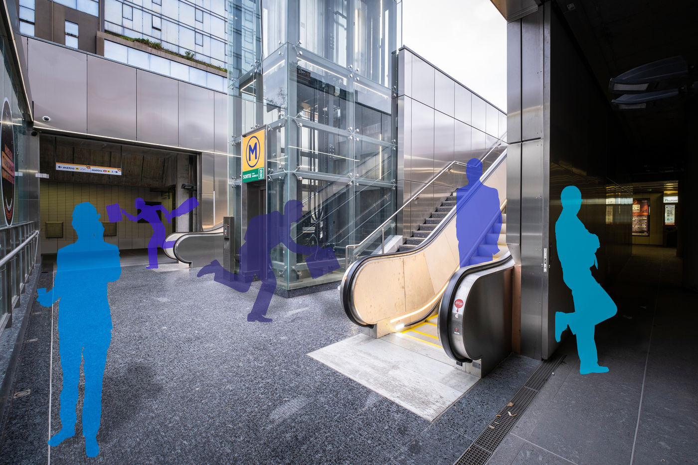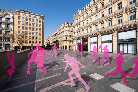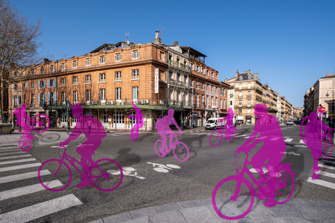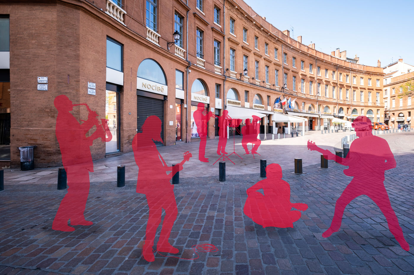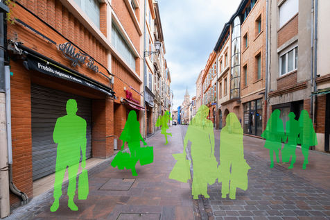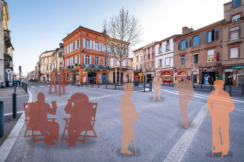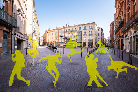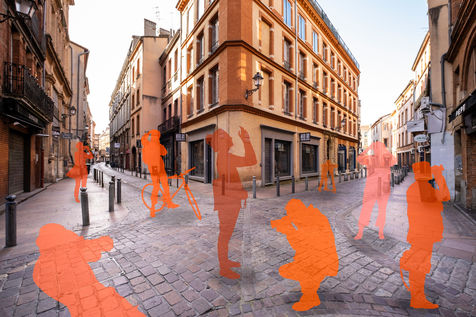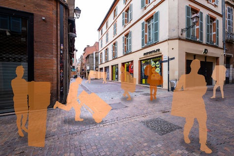 Toulouse at the time of confinement following the coronavirus pandemic which affected the majority of countries. Deserted streets in the middle of the day. An everyday animation that has disappeared. In the manner of architects who inlay people on 3D perspectives in order to obtain a rendering closer to real life, I wanted to give back to the city its lost dynamism by inlaying silhouettes of people, who are not quite present.