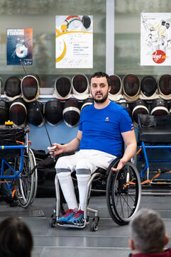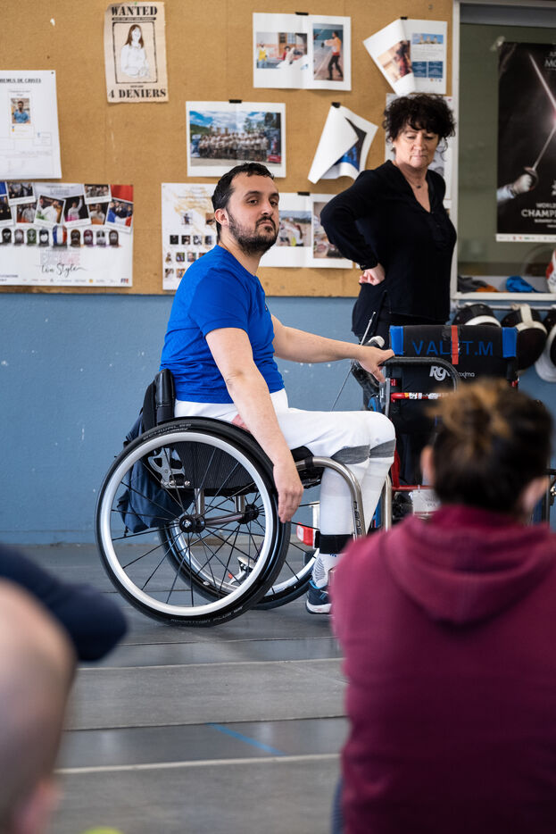 Portrait of Maxime Valet, disabled fencer in a wheelchair. Rio 2016 and Tokyo 2020 medalist, he is preparing for the Paris 2024 Paralympic Games. That day, he trains with his master-at-arms while raising awareness about disabled sports for sports educators.