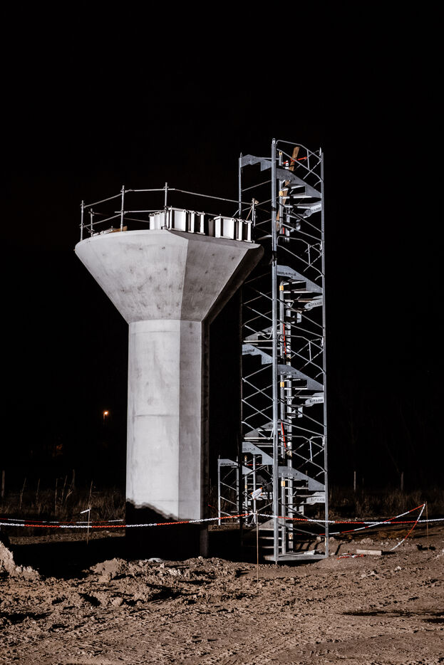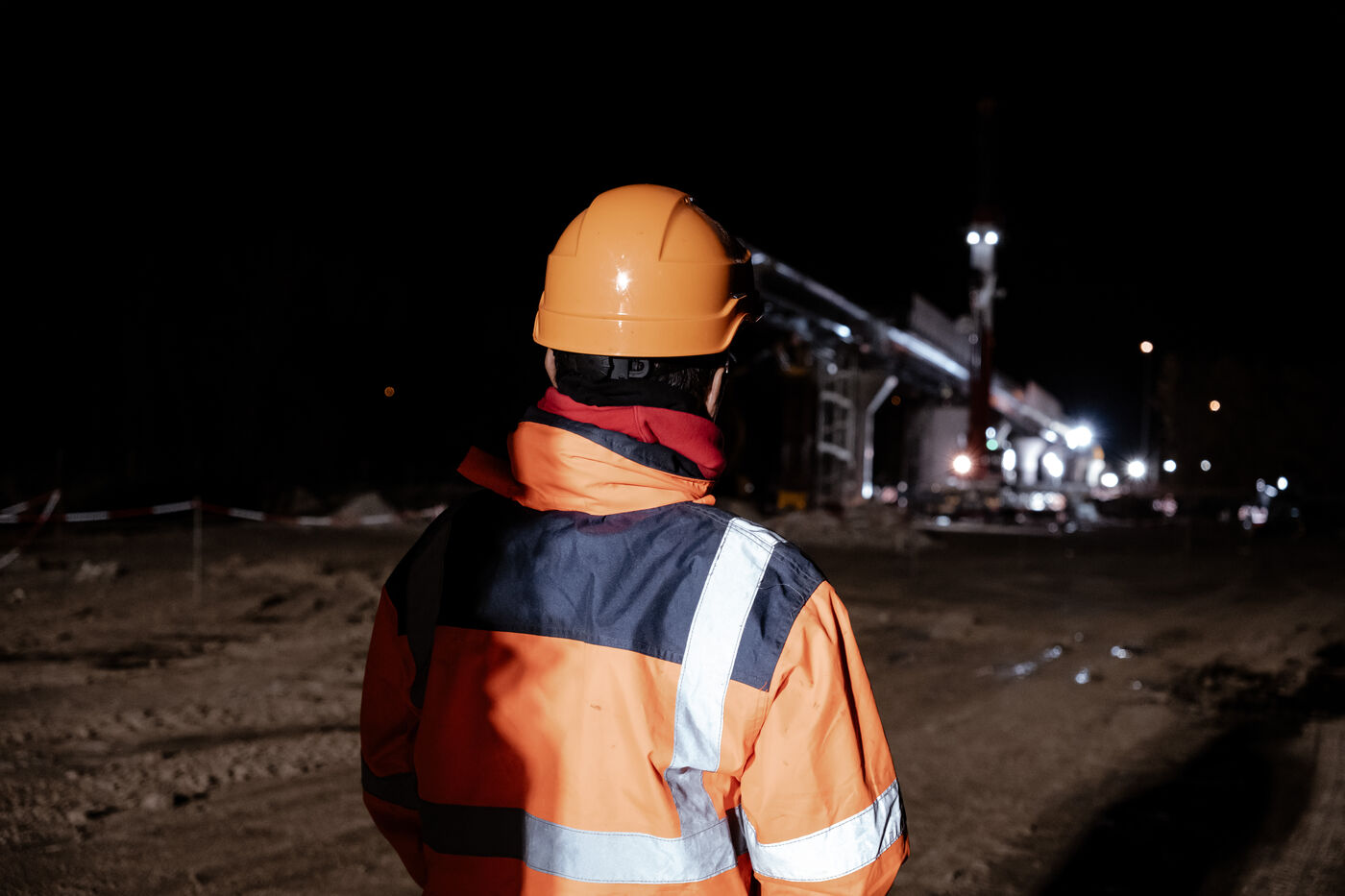 Travaux nocturnes sur le chantier de la troisième ligne de métro, pour le lançage du viaduc sur l'autoroute, entre Ramonville et Labege. A l'aide d'un treuil, le tablier du viaduc du futur métro est poussé au-dessus de l'autoroute qui a été fermée pour l'occasion.