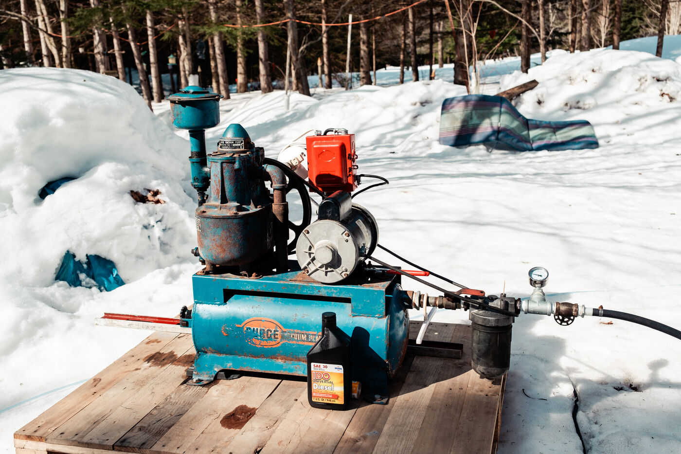 The sugar season begins when daytime temperatures are above zero degrees Celsius while remaining below freezing at night, it lasts between 4 and 6 weeks in spring. At this time, the sugar shacks are busy transforming the maple sap collected via a system of tubing into maple syrup. The water passes through an evaporator to concentrate the sugar; it takes on average 40 liters of water to make one liter of maple syrup.