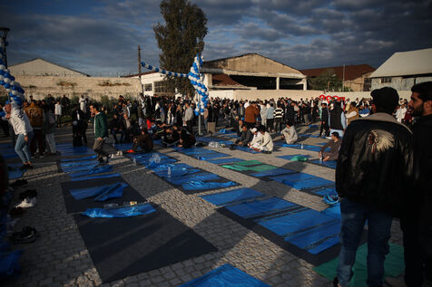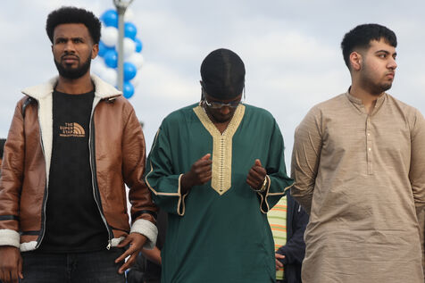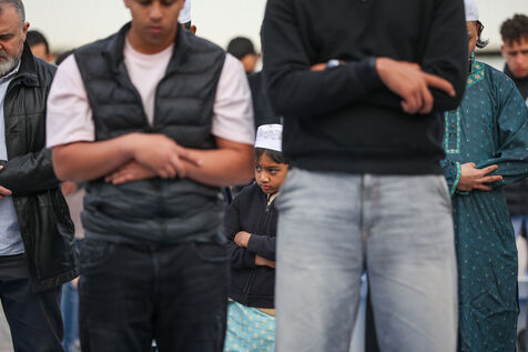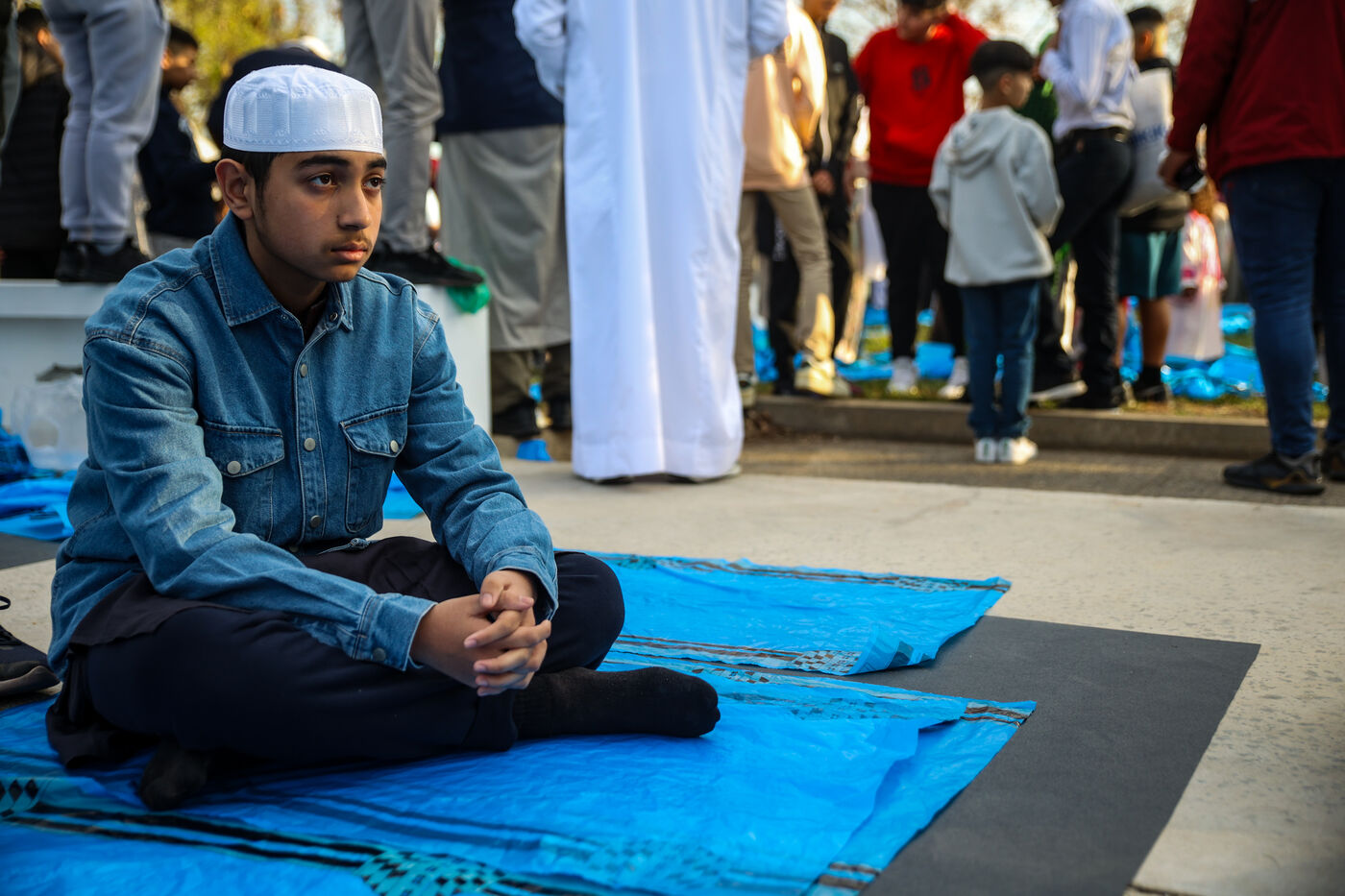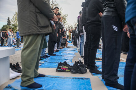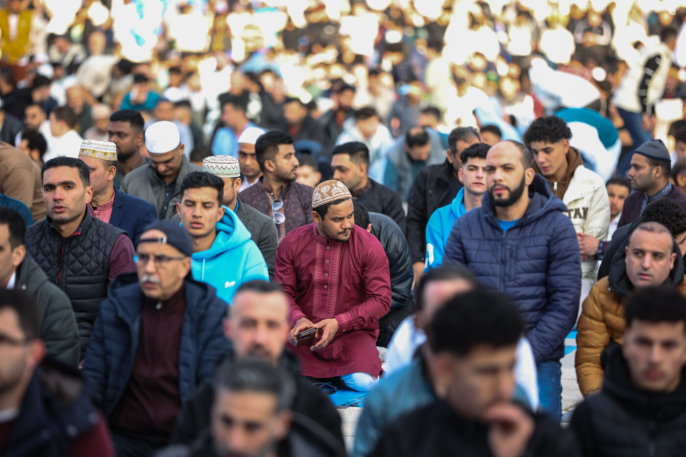 Les musulmans prient pendant la celebration de l Aïd al-Fitr, marquant la fin du jeûne d'un mois du Ramadan, de l'aube au coucher du soleil, pour l'une des plus grandes fêtes du calendrier islamique, à la mosquée Centrale d'Athènes, à Votanikos le 30 Mars 2025