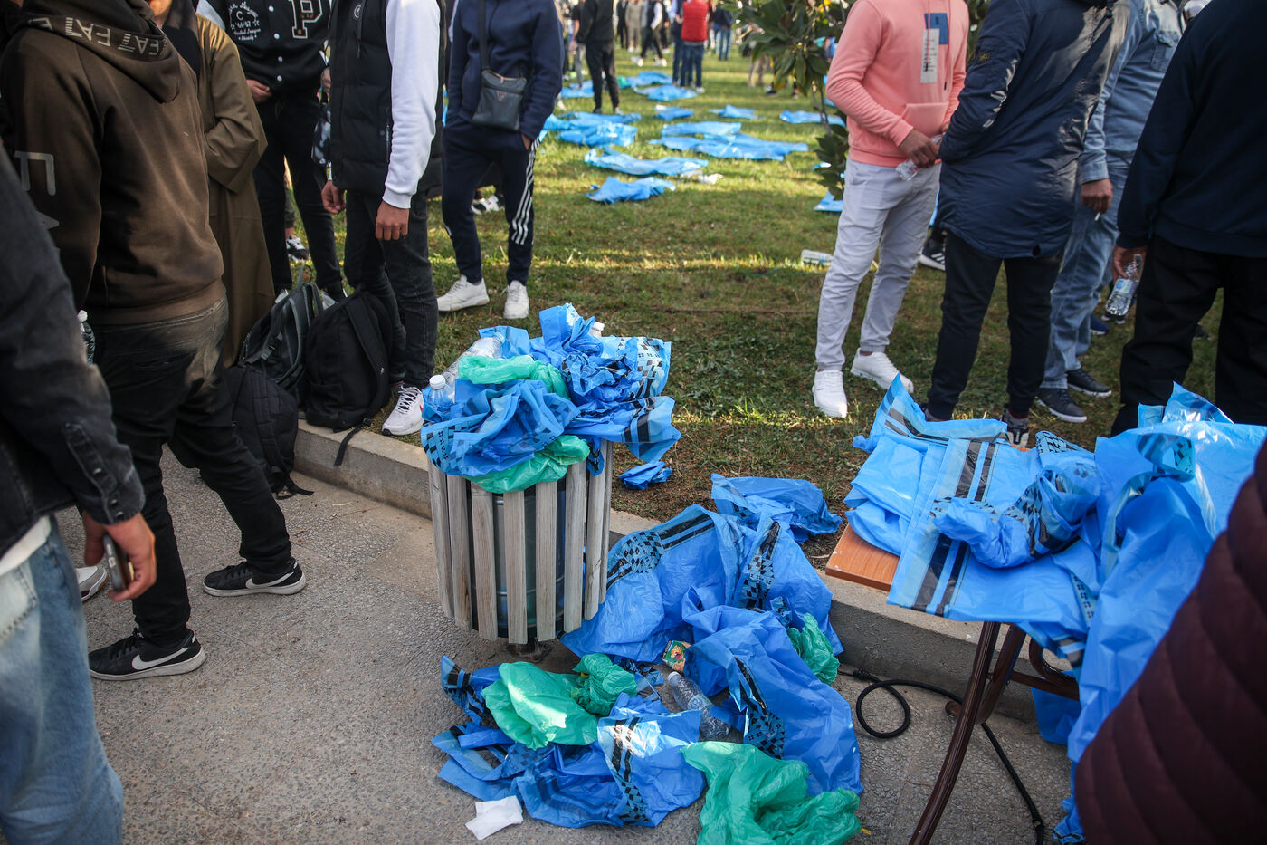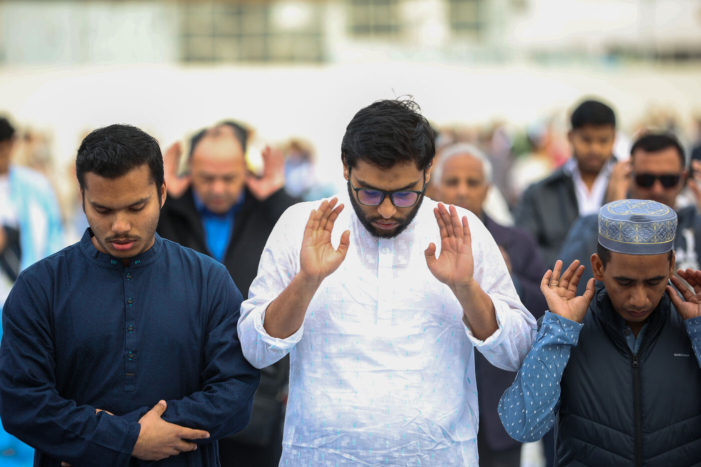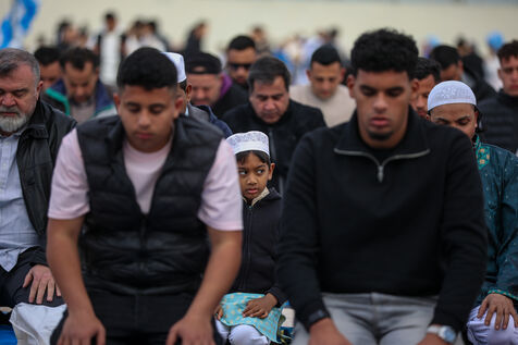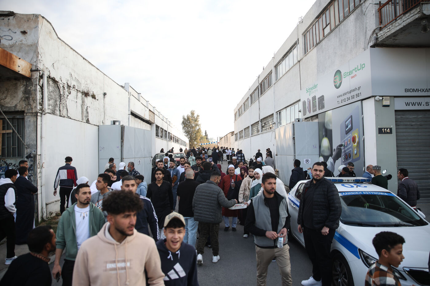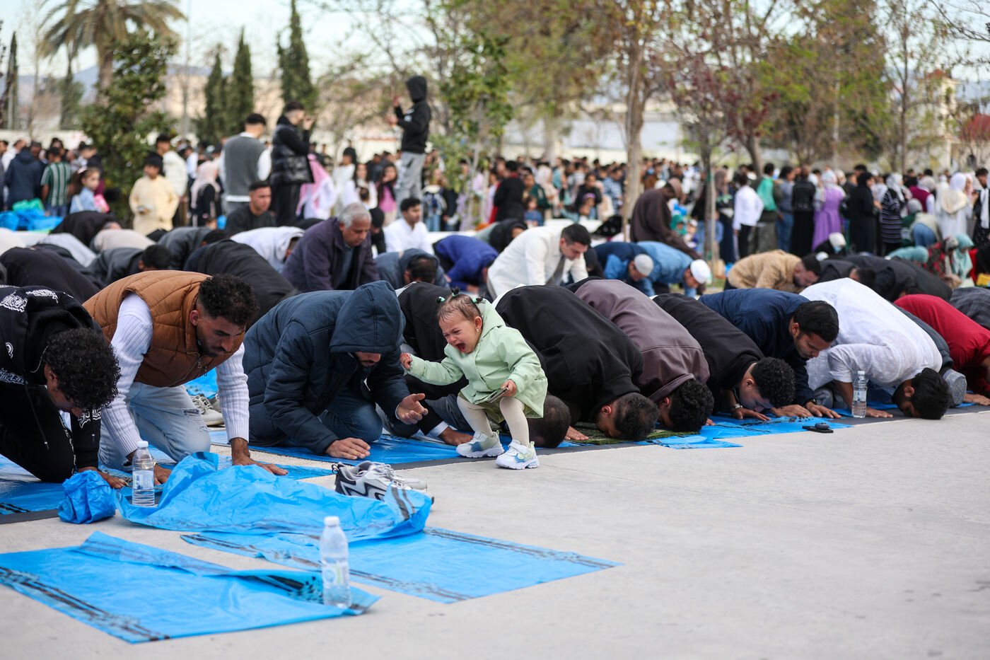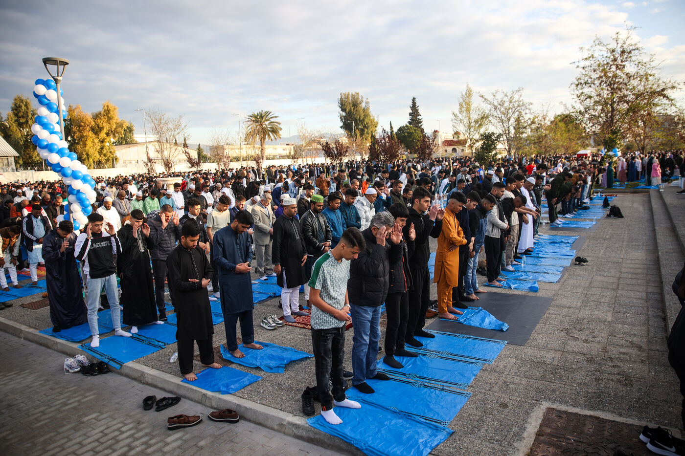 Muslims pray during the celebration of Eid al-Fitr, marking the end of the month-long dawn-to-sunset fasting of Ramadan for one of the biggest festivals of the Islamic calendar, at the Central Mosque of Athens, in Votanikos on March 30 2025.