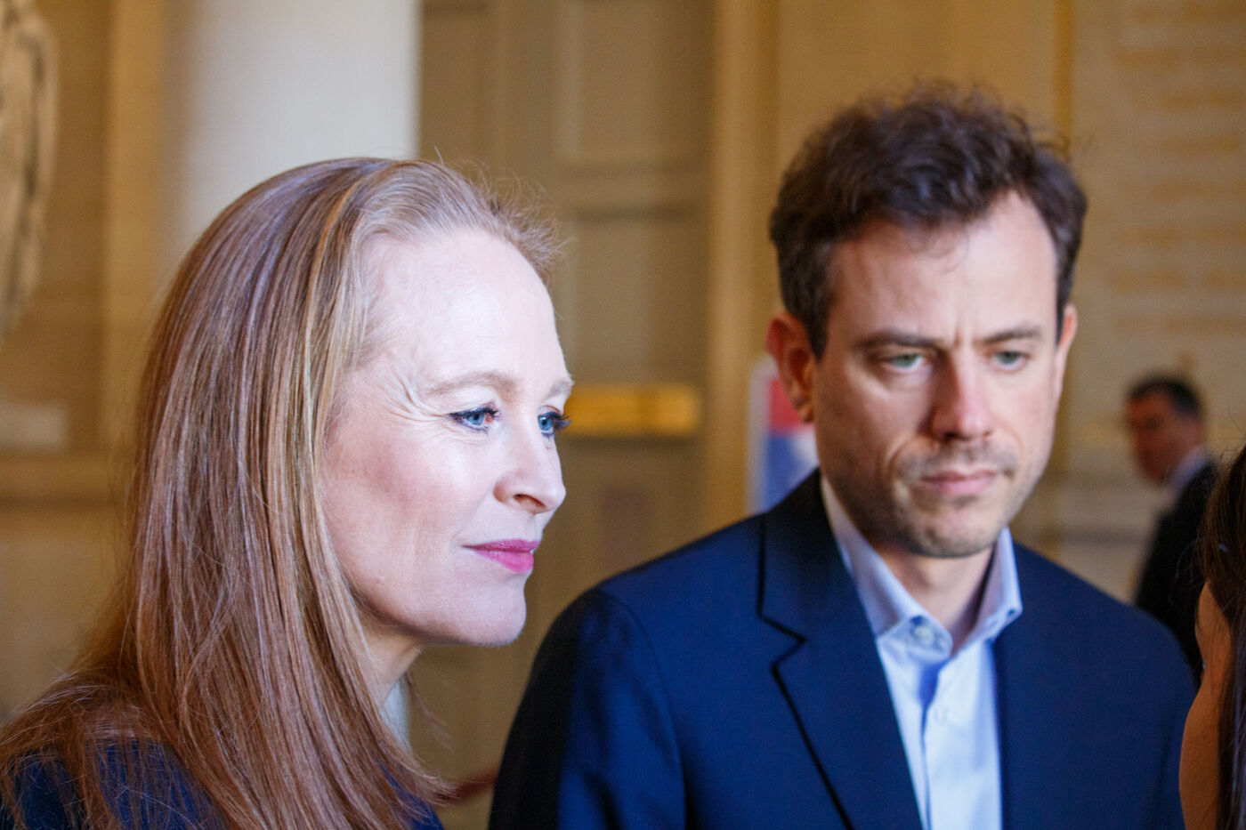 Les députés rapporteurs Violette Spillebout et Paul Vannier, ainsi que la présidente de commission Fatiha Keloua-Hachi, avant leur table ronde reunissant des représentants de collectifs de victimes, cycle d'auditions dans le cadre de l'enquête sur les modalités du contrôle par l'Etat et de la prévention des violences dans les établissements scolaires, députés de la commission d'enquête de la Commission des affaires culturelles et de l'éducation dans la salle Lamantine de l'Assemblée Nationale à Paris, France le 20 mars 2025.