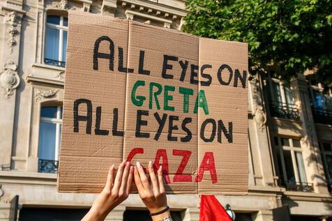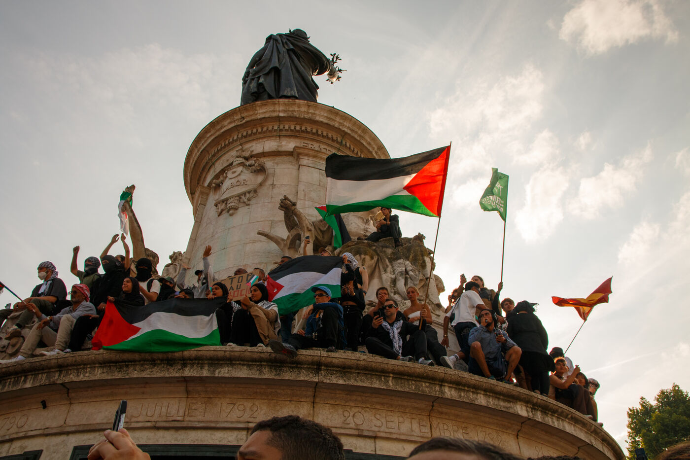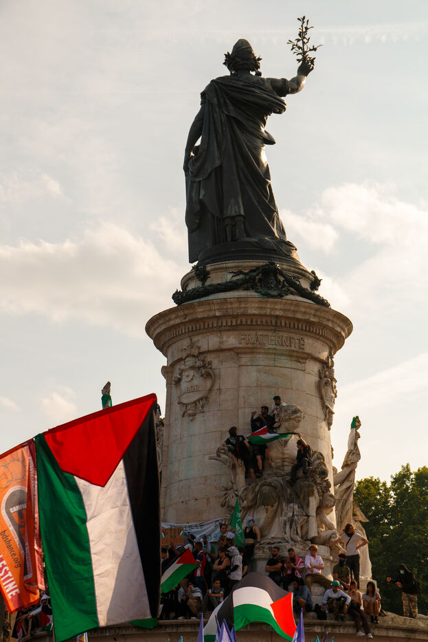 Demonstration following the arrest of the Madleen humanitarian boat, and in support of the people of Gaza, against the ongoing genocide and for an immediate ceasefire, Place de la République, in Paris, France on June 9, 2025.