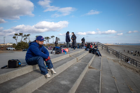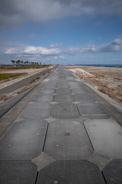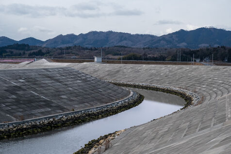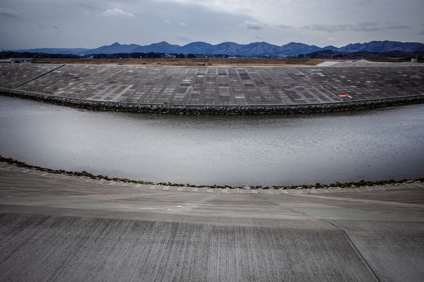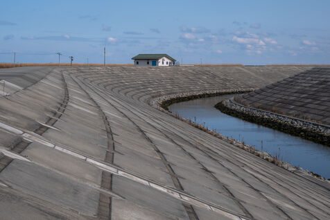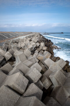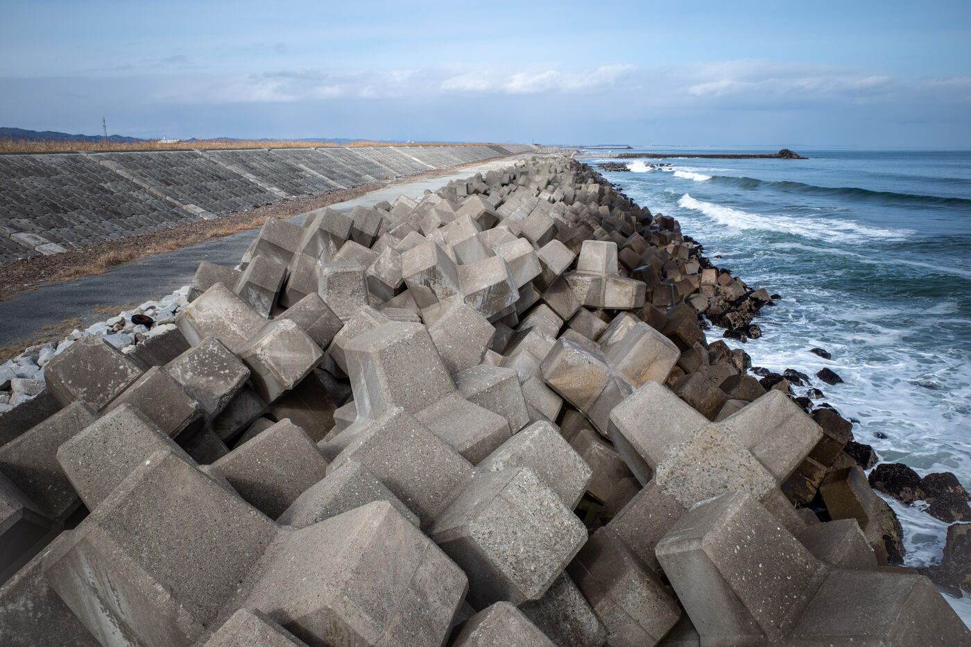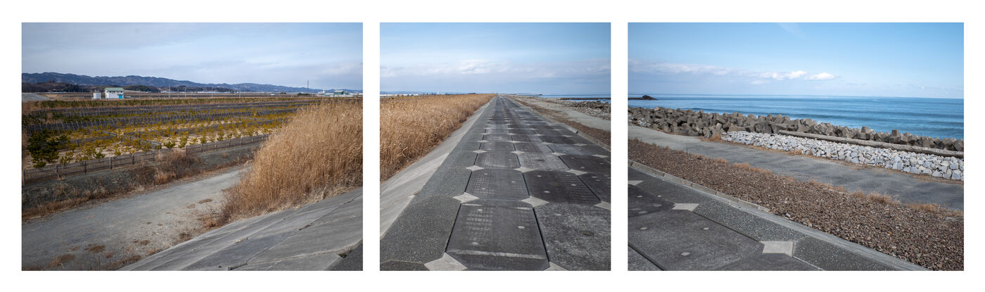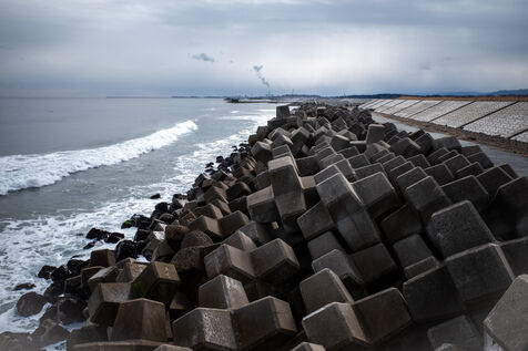 C'est une véritable muraille de béton qui se dresse désormais sur la totalité du littoral de la baie de Sendai ainsi que sur les côtes du Nord-Est. La réaction des autorités japonaises à la catastrophe de 2011, qui a couté la vie de près de 20,000 personnes, fut de déverser une quantité faramineuse de béton le long des côtes. Les digues construites font entre 5 et 15 mètres de hauteur. Elles sont censées protéger les habitants des plaines basses de l'avancée de la mer en cas de tsunami, ou du moins, ralentir sa course pour permettre aux personnes d'évacuer en terrain sûr. Au délà de l'efficacité discutable d'une telle proposition, c'est tout une organisation géographique et mentale qui est chamboulée. Les liens entre terres et mer sont détruits, les estuaires et embouchures de rivières sont désormais endigués, barrés purement et simplement par les ouvrages colossaux. Ce déchainement s'est fait au profit des entreprises de btp japonaises, grandes gagnantes de ce remaniement des cartes. Les habitants doivent quant à eux apprendre à vivre sans pouvoir regarder la mer comme ils avaient l'habitude de le faire.