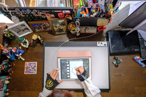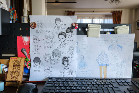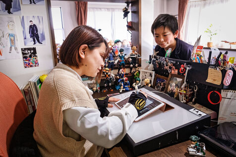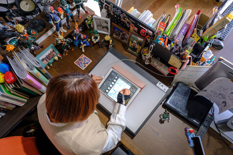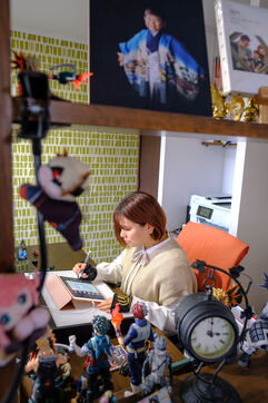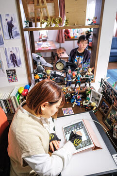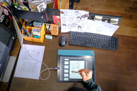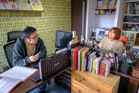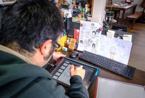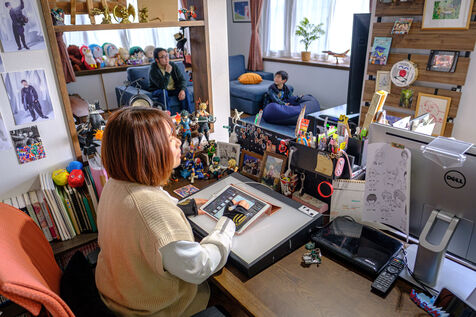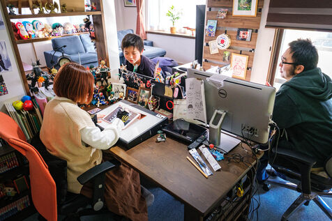 Marie Sasano is the author of "Momo et le messager du Soleil," a children's manga published by Ki-oon in 2018. Her husband Ryosuke Tanno works as an art teacher in a high school, but also has experience as a mangaka. Marie and Ryosuke live in a house surrounded by rice fields near the city of Sendai, 300 km north of Tokyo with their son Yujin. They are a rare case in the manga world dominated by solitary mangakas who often live in Tokyo or its region. Far from the frenzy of the great Japanese metropolis, the couple cultivates the art of telling stories in images while raising a child. They work from home, in their house in the suburbs of Sendai regularly shaken by earthquakes. Their desks are touching, which is good because they will work together on their next project. From their workstations they can look at their son Yujin who is playing the console.