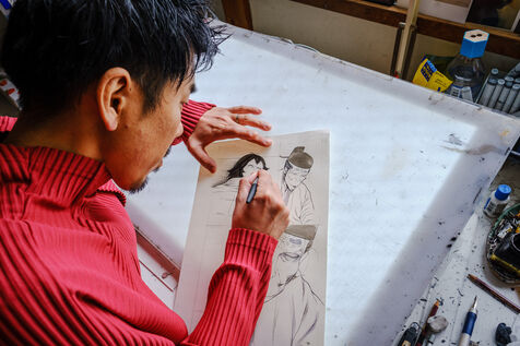 Il travaille toujours de manière analogique, avec des crayons et de l'encre, puis il numérise et termine son processus de création de manière numérique. Pour l'aider, Todo a 3 assistants.