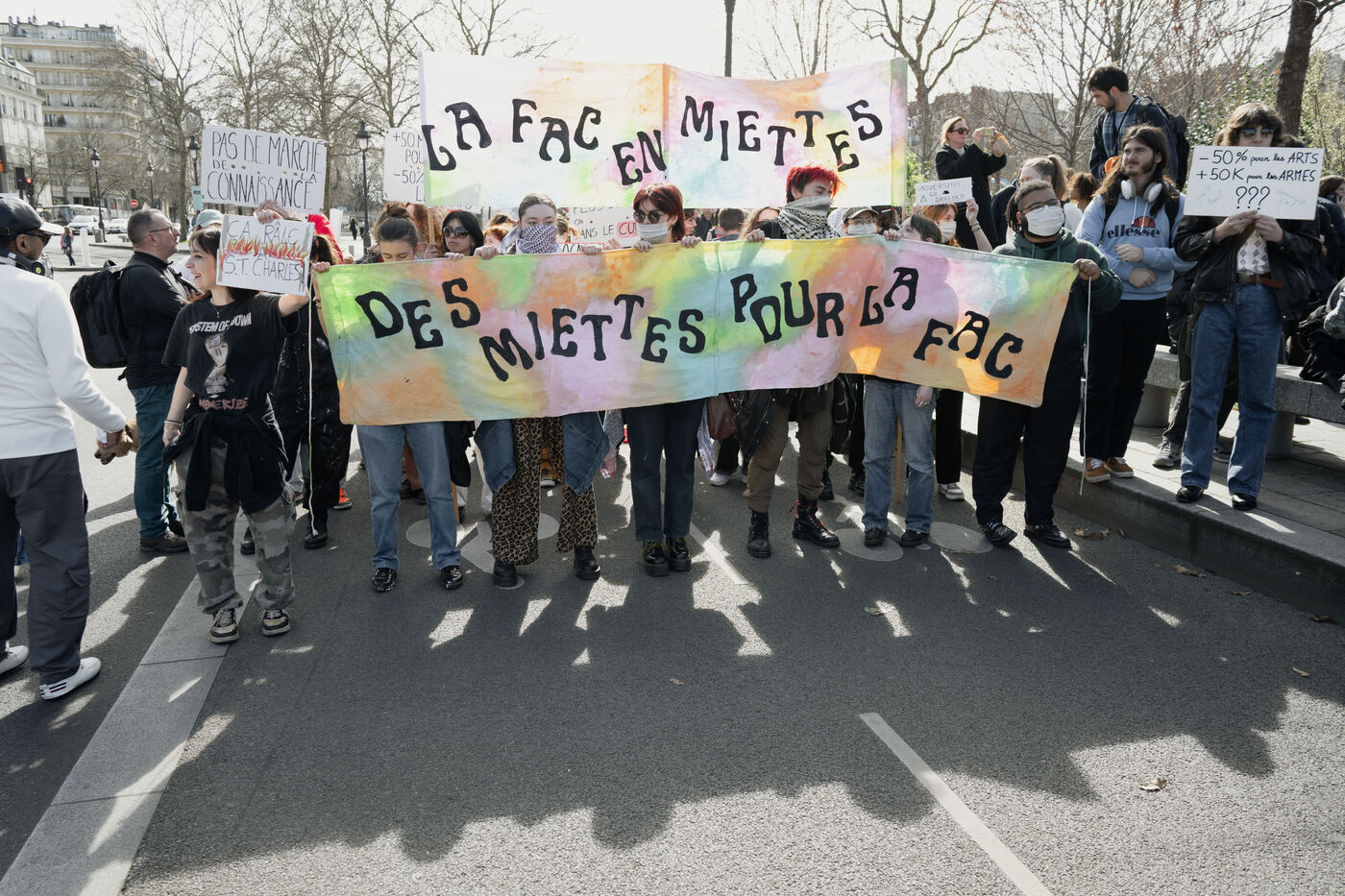Manifestation des intermittents et salariés des institutions culturelles contre la baisse des moyens accordés par le Gouvernement à la Culture, notamment le Pass Culture, à Paris en France le 20 mars 2025.
