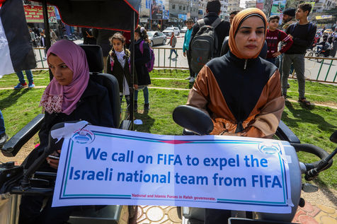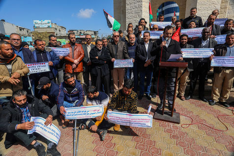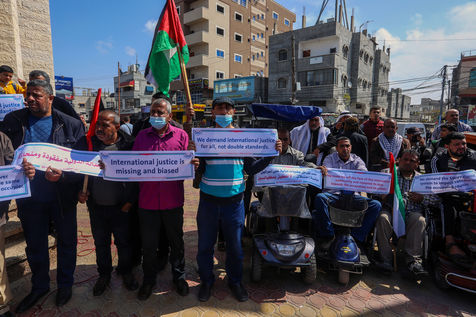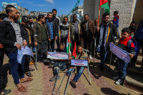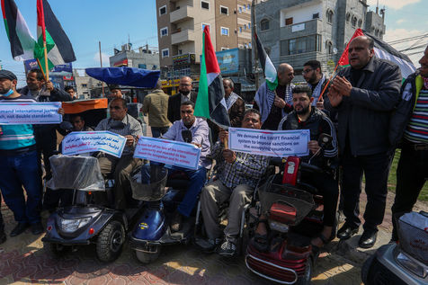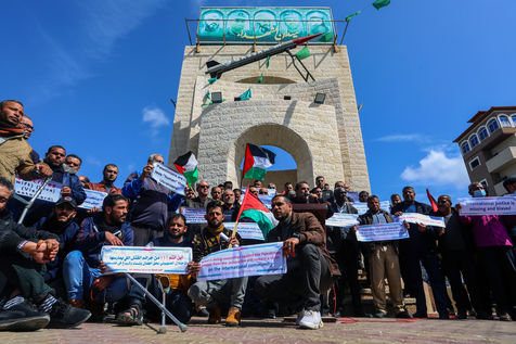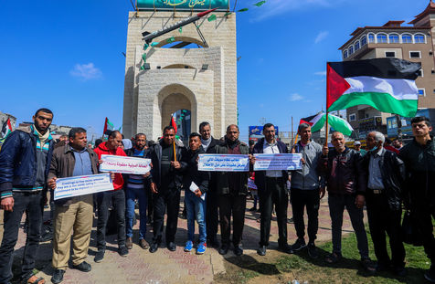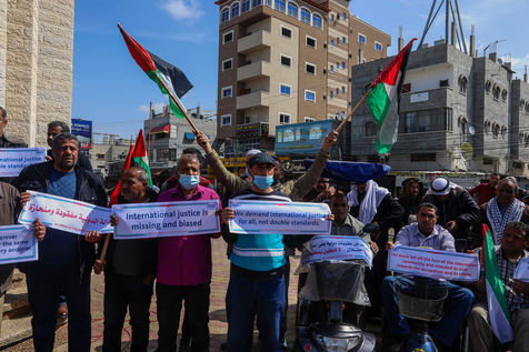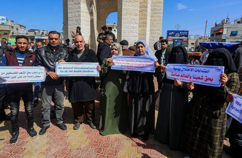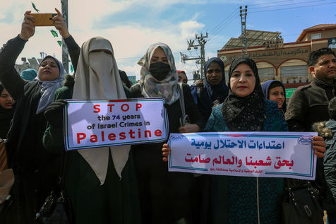 RAFAH, GAZA STRIP - MARCH 07. The national and Islamic forces factions join the march rejecting and denouncing double standards and double standards in the West in dealing with our Palestinian cause and rights and condoning the crimes of the Israeli occupation that has been going on for 74 years, and as it demands all countries of the world to stand by the Palestinian cause, similar to what was presented to the Ukrainians against Russia. In the Rafah refugee camp in the southern Gaza Strip, on March 7, 2022.