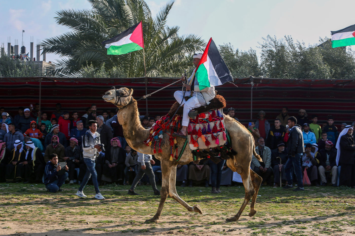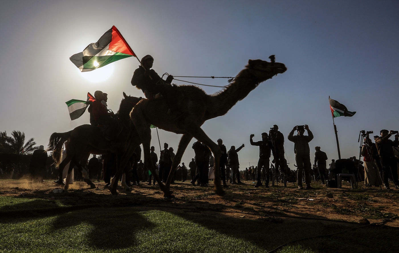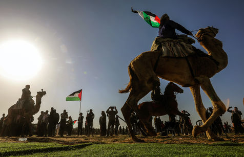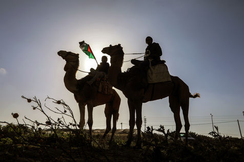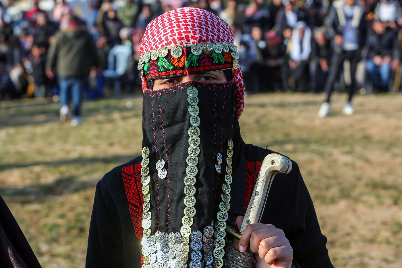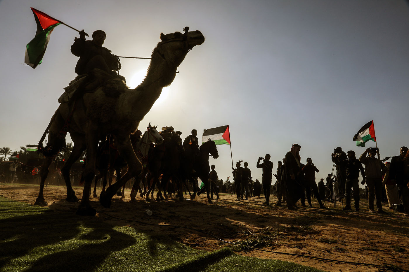Deir al-Balah, GAZA STRIP - MARCH 27. Palestinian Bedouins take part in a commemoration of Land Day in Deir al-Balah camp in the central Gaza Strip, March 27, 2022. Land Day marks an incident in 1976 when Israeli forces shot and killed six people during protests against land confiscation. Photograph by Abed Rahim Mohammed / Hans Lucas.