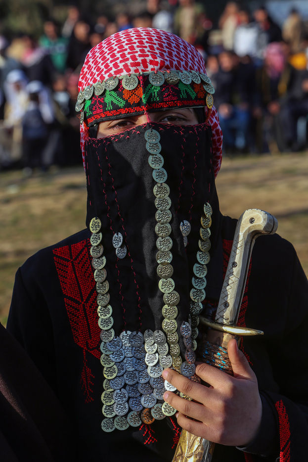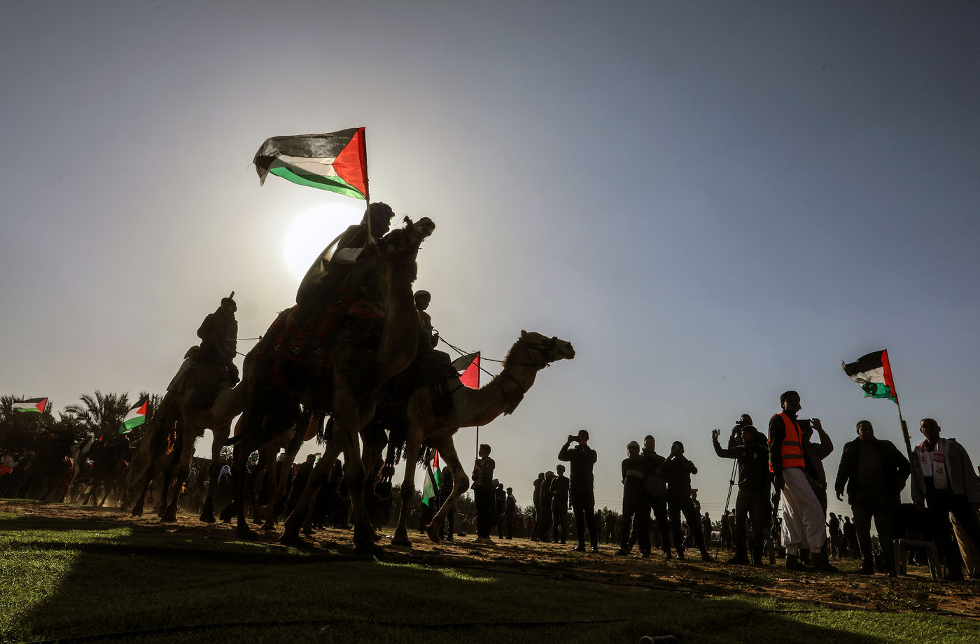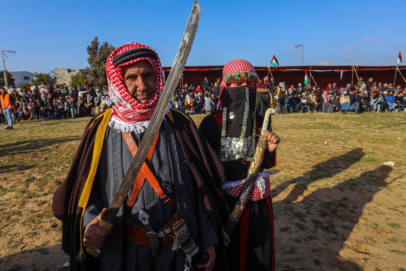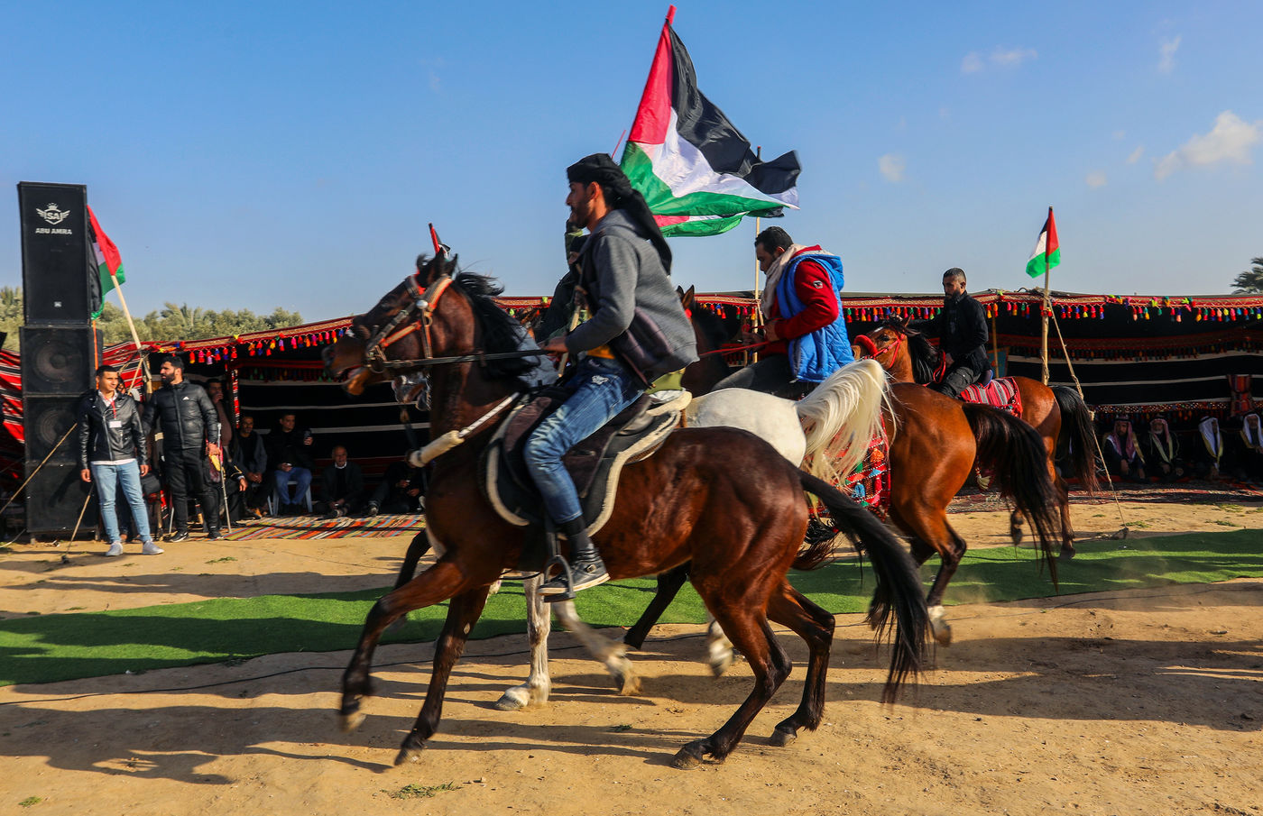 Deir al-Balah, GAZA STRIP - MARCH 27. Palestinian Bedouins take part in a commemoration of Land Day in Deir al-Balah camp in the central Gaza Strip, March 27, 2022. Land Day marks an incident in 1976 when Israeli forces shot and killed six people during protests against land confiscation. Photograph by Abed Rahim Mohammed / Hans Lucas.