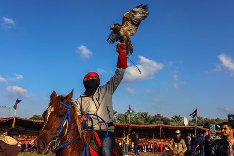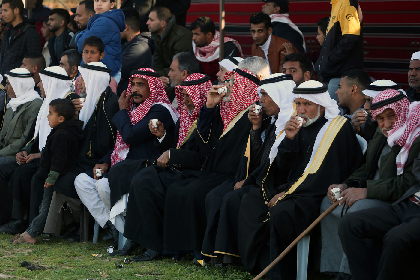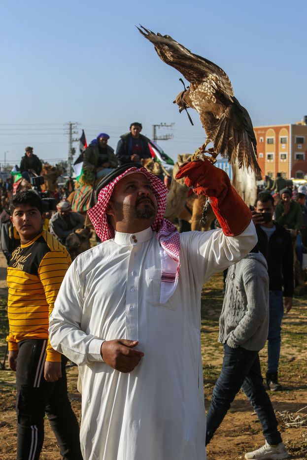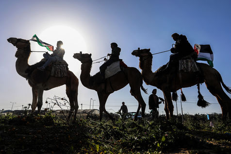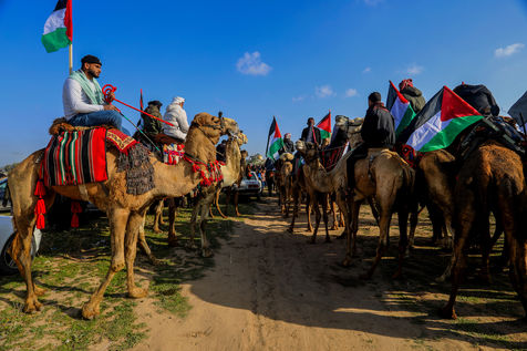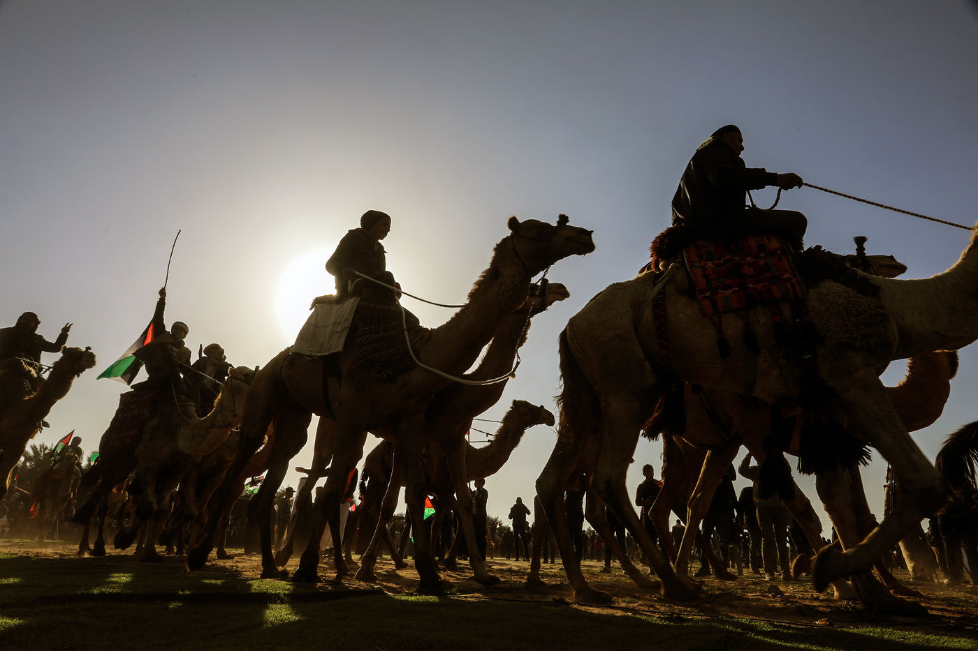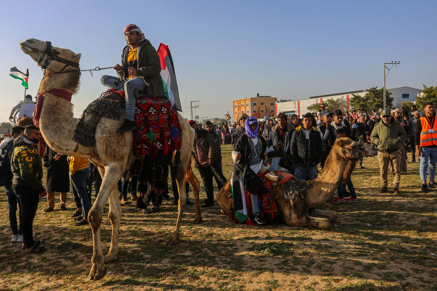 Deir al-Balah, GAZA STRIP - MARCH 27. Palestinian Bedouins take part in a commemoration of Land Day in Deir al-Balah camp in the central Gaza Strip, March 27, 2022. Land Day marks an incident in 1976 when Israeli forces shot and killed six people during protests against land confiscation. Photograph by Abed Rahim Mohammed / Hans Lucas.
