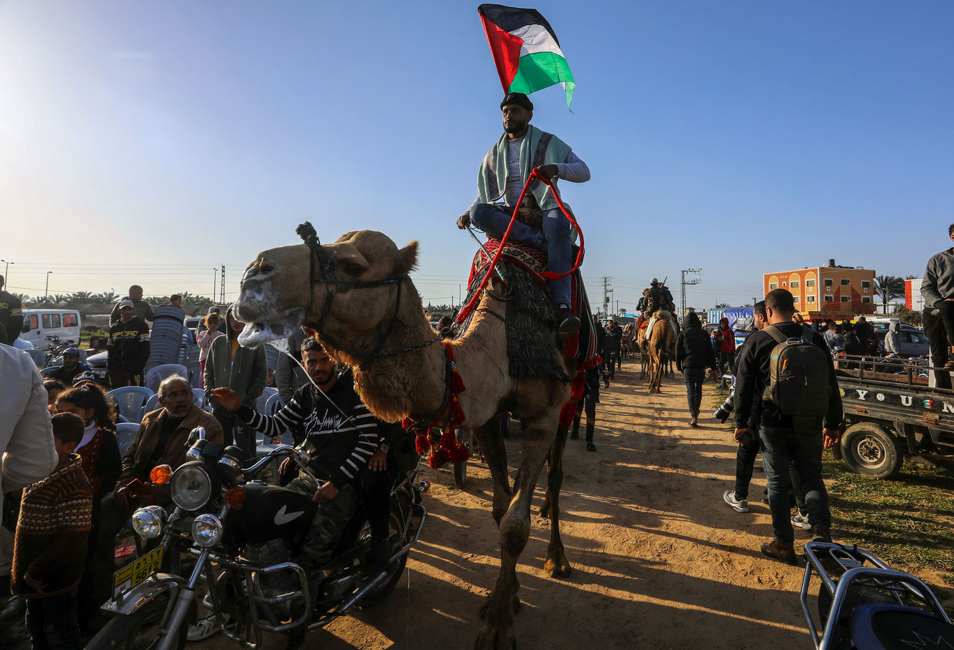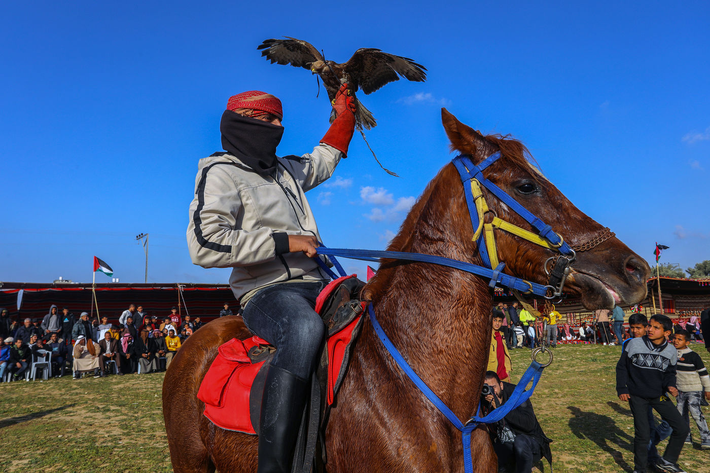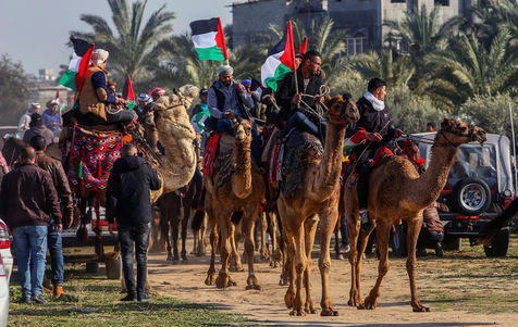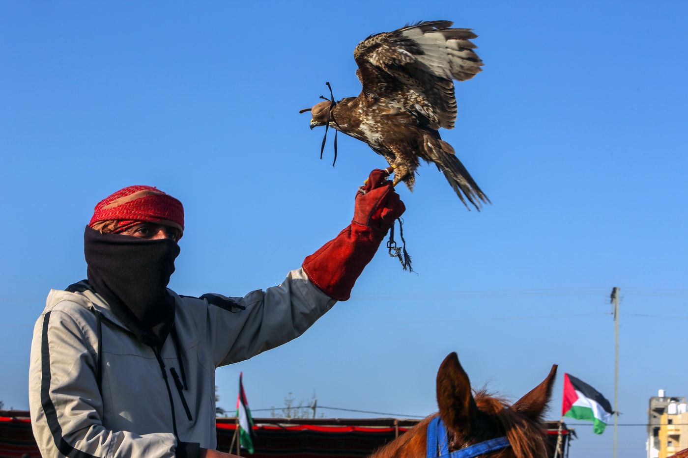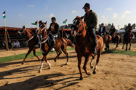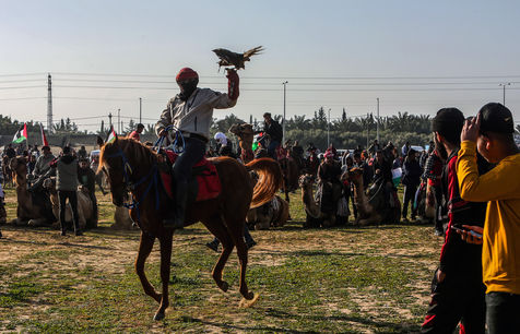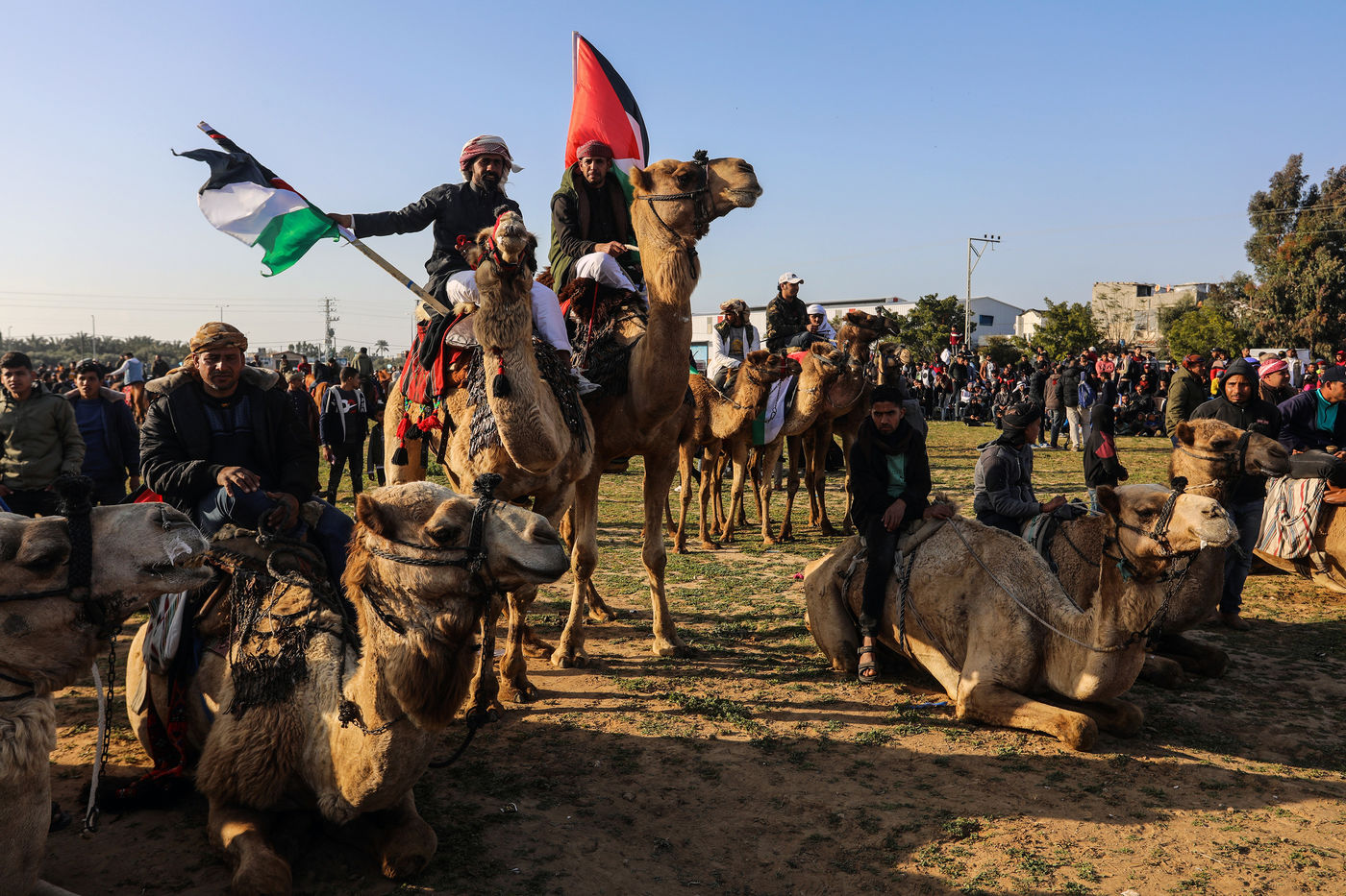 Deir al-Balah, GAZA STRIP - MARCH 27. Palestinian Bedouins take part in a commemoration of Land Day in Deir al-Balah camp in the central Gaza Strip, March 27, 2022. Land Day marks an incident in 1976 when Israeli forces shot and killed six people during protests against land confiscation. Photograph by Abed Rahim Mohammed / Hans Lucas.
