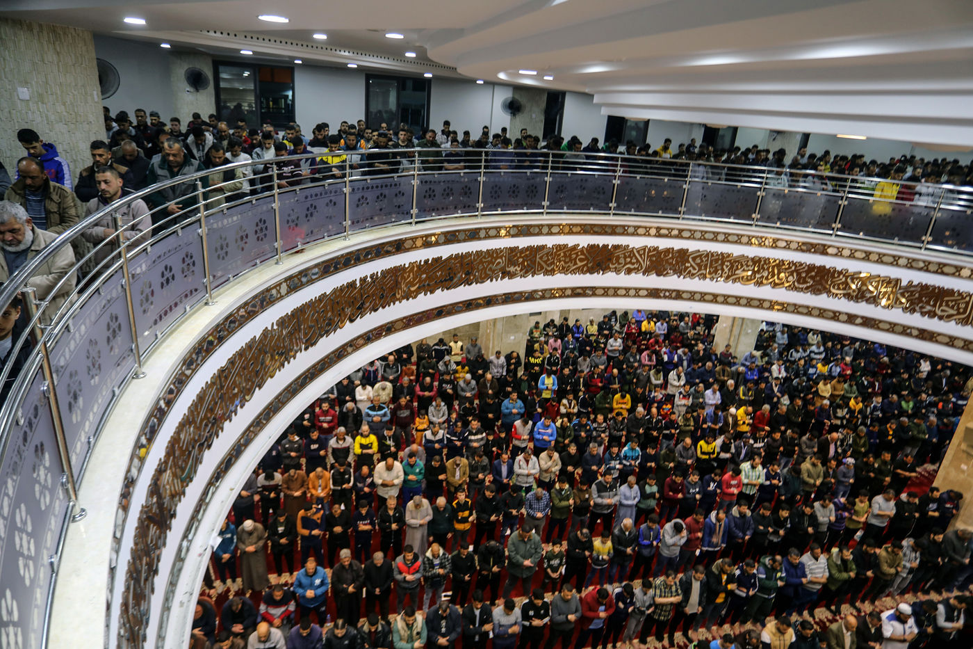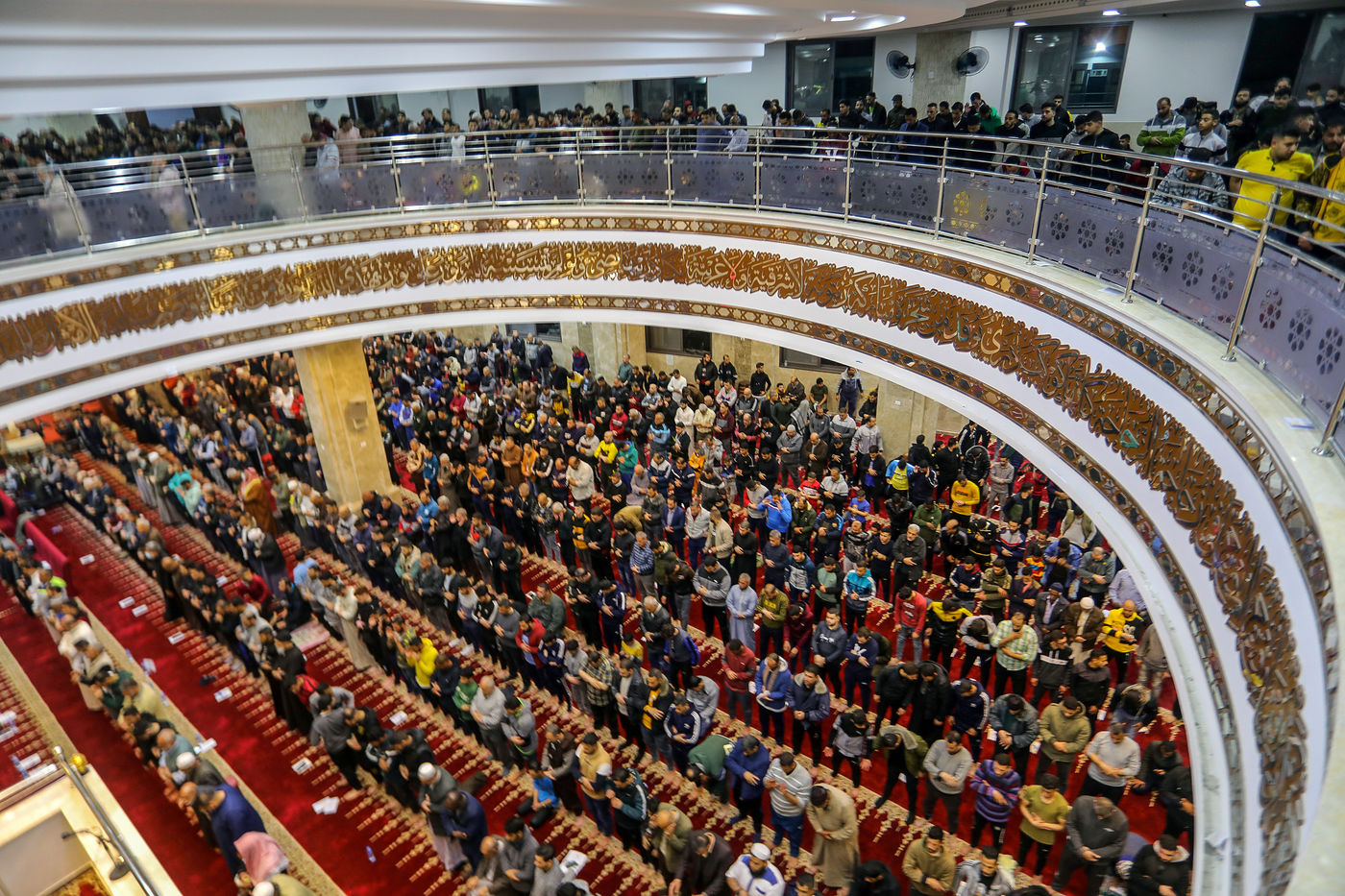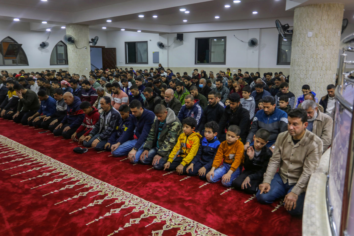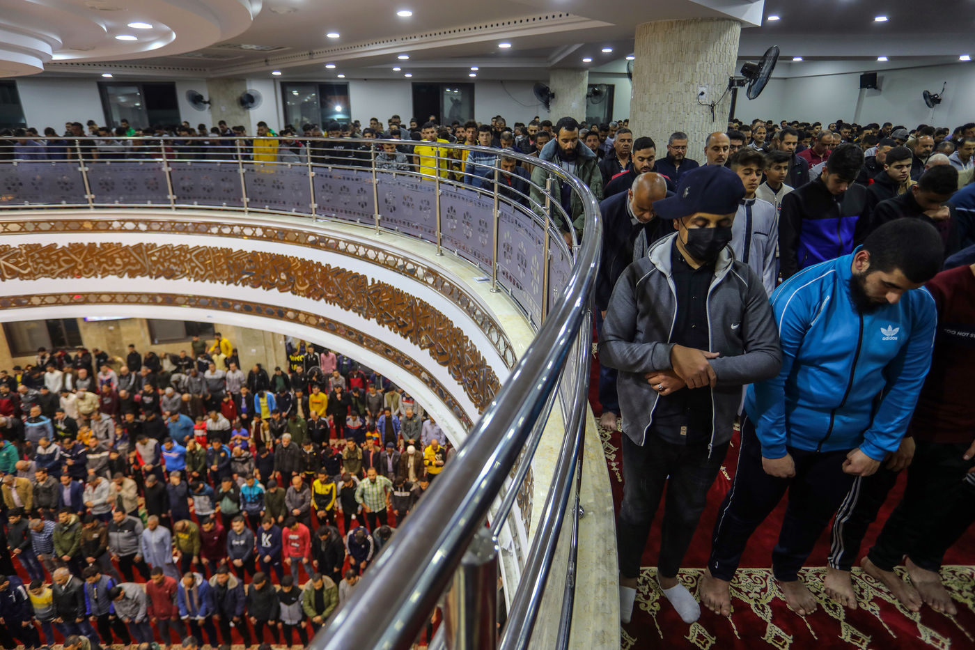 RAFAH, GAZA STRIP - APRIL 02. Muslim worshippers perform the first evening Tarawih prayer on the first night of the holy fasting month of Ramadan, at the Great Al-Awda Mosque in the city of Rafah in the southern Gaza Strip, on April 2, 2022.