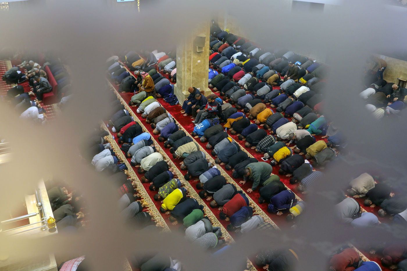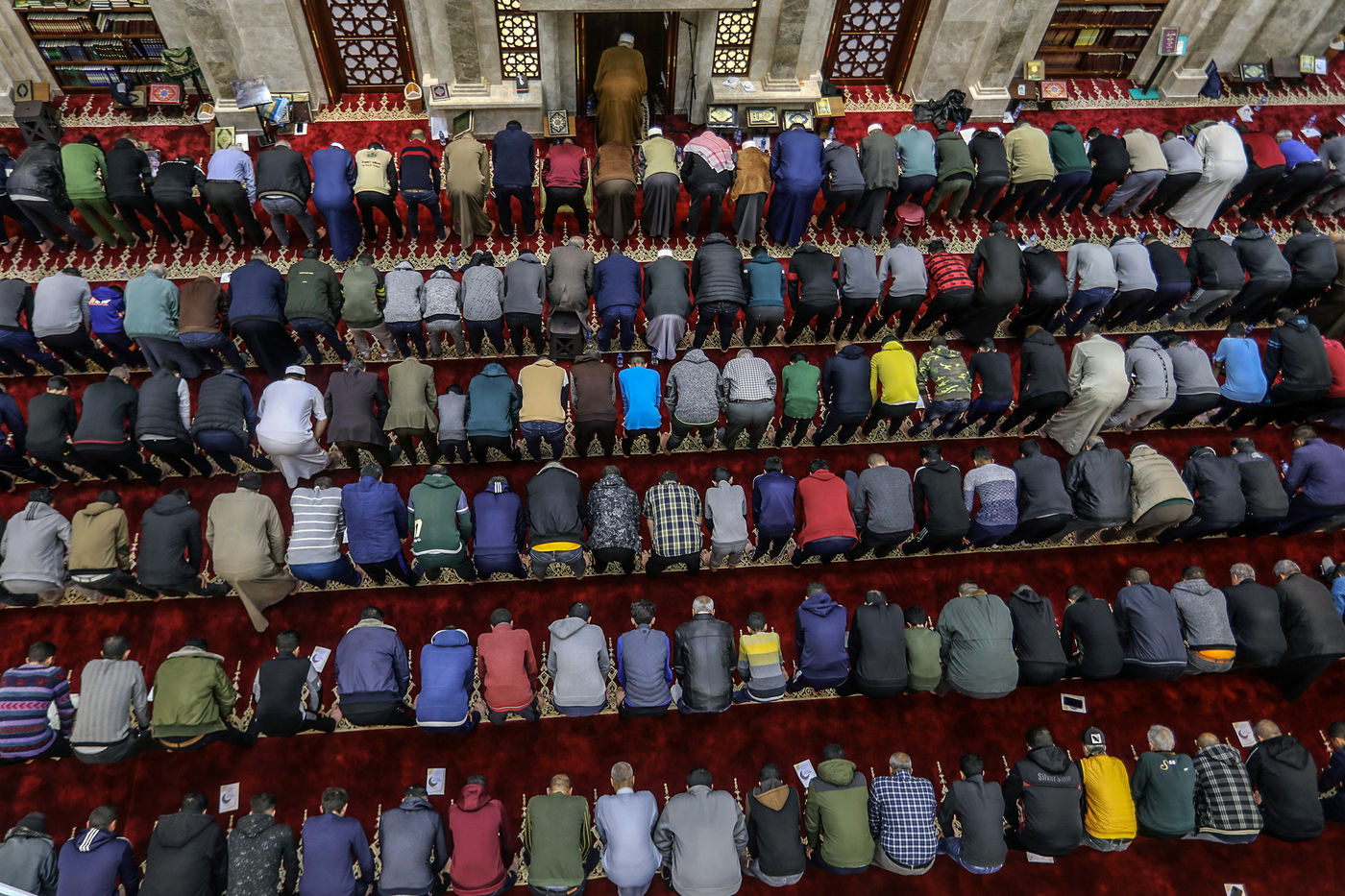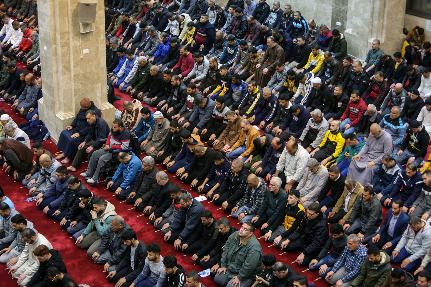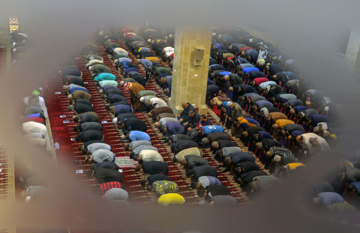 RAFAH, GAZA STRIP - APRIL 02. Muslim worshippers perform the first evening Tarawih prayer on the first night of the holy fasting month of Ramadan, at the Great Al-Awda Mosque in the city of Rafah in the southern Gaza Strip, on April 2, 2022.