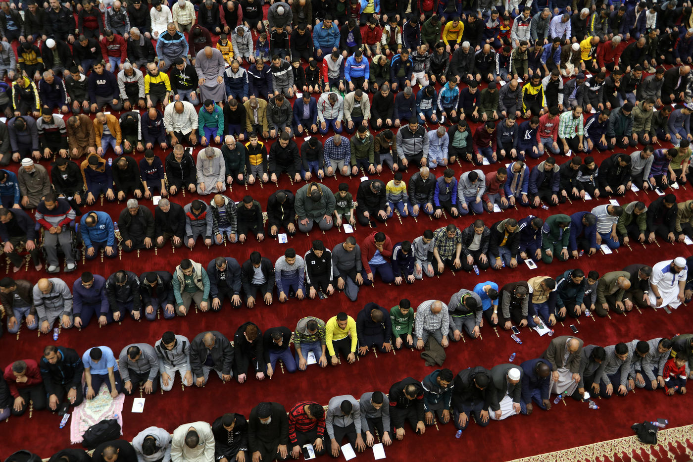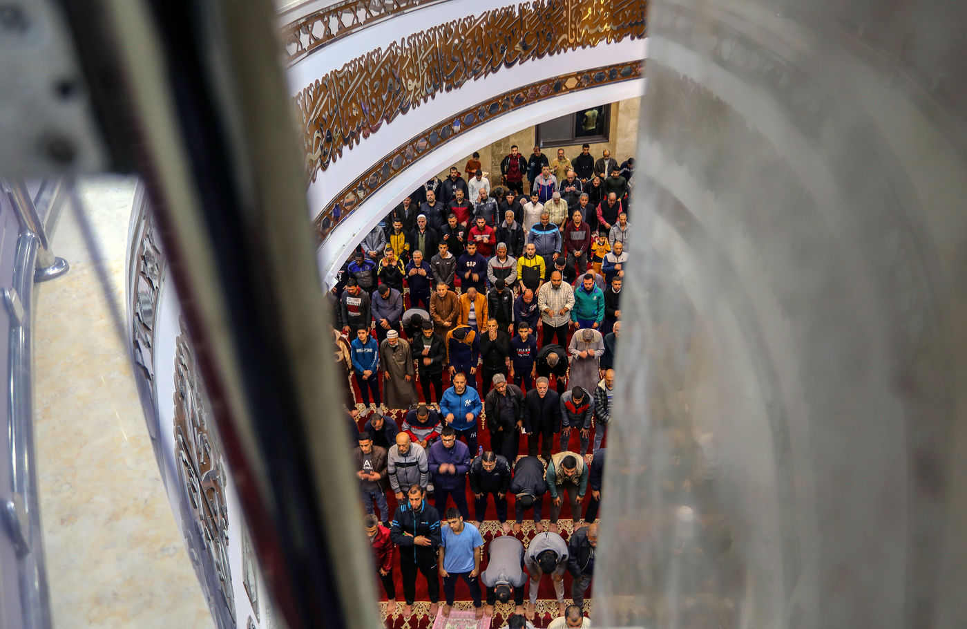 RAFAH, BANDE DE GAZA - 02 APRIL. Des fidèles musulmans effectuent la première prière Tarawih du soir, la première nuit du mois sacré de jeûne du Ramadan, à la grande mosquée Al-Awda dans la ville de Rafah, dans le sud de la bande de Gaza, le 2 avril 2022. Photographie de Abed Rahim Mohammed / Hans Lucas.