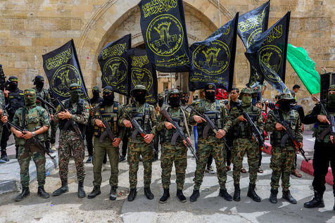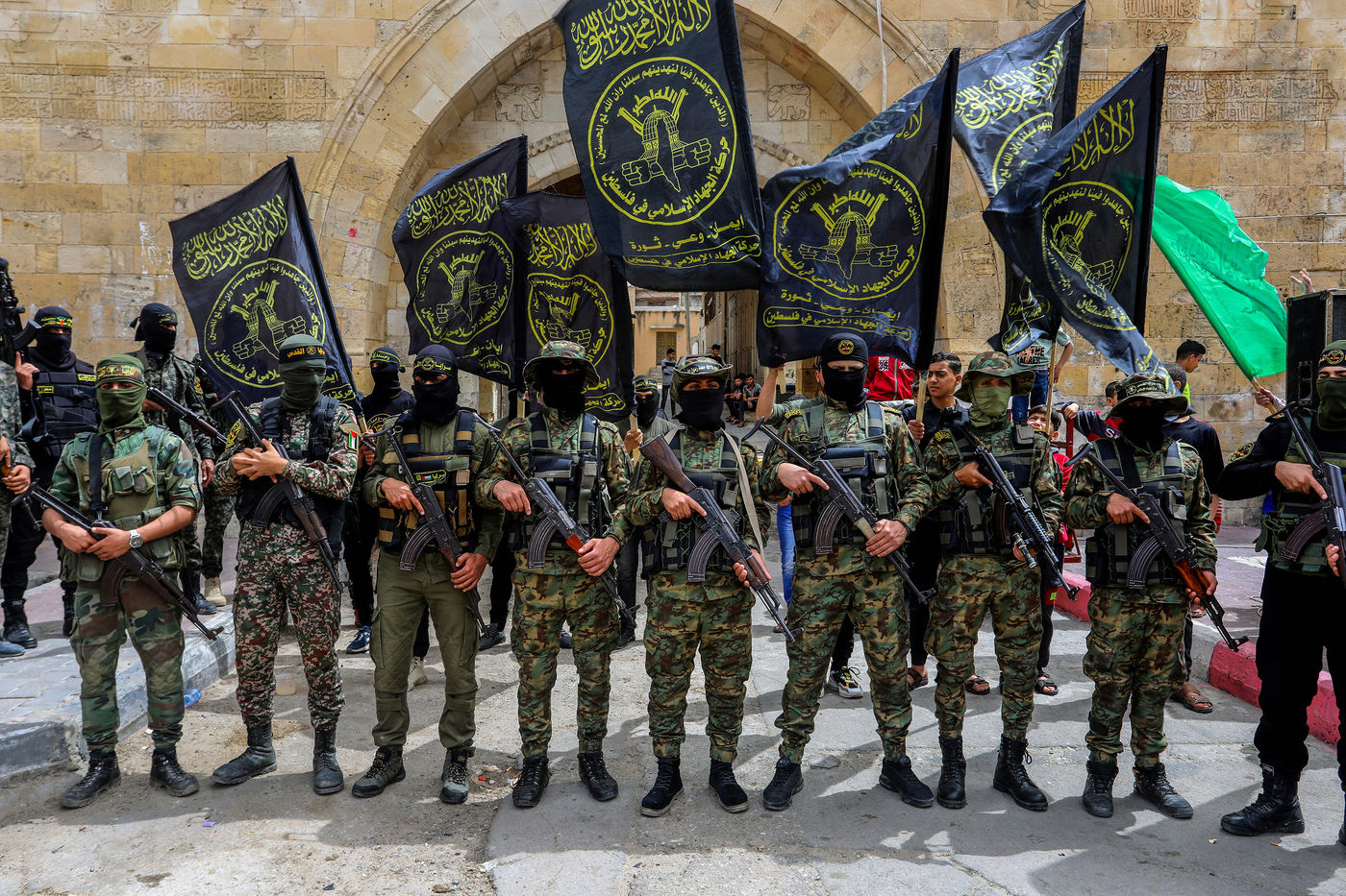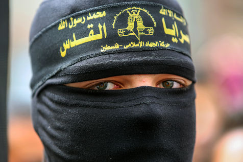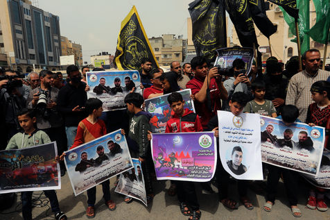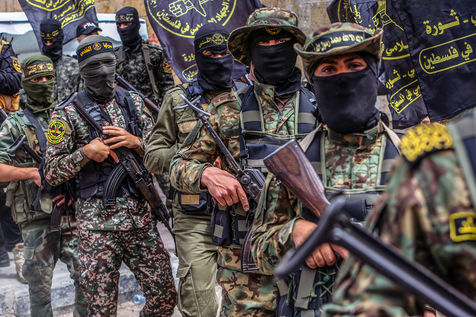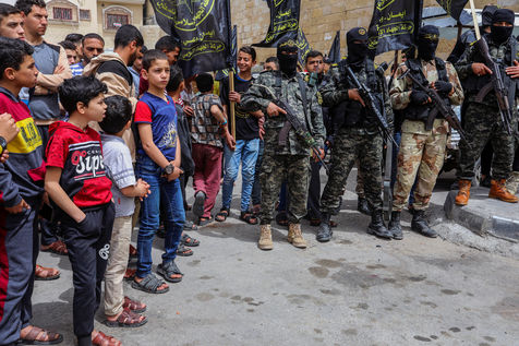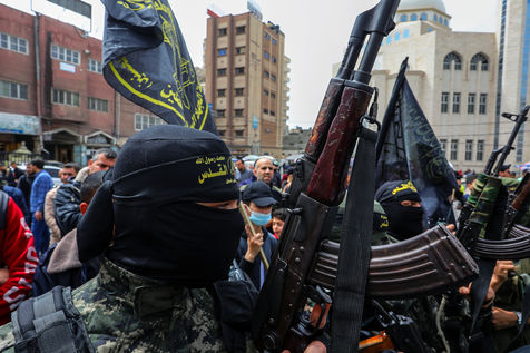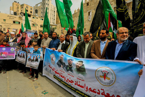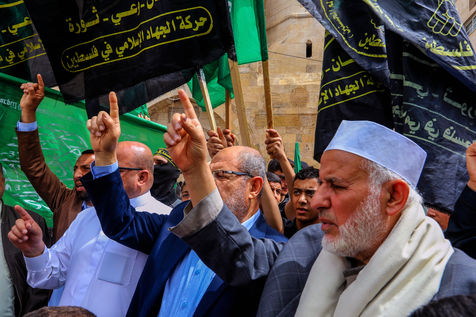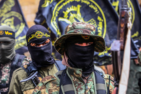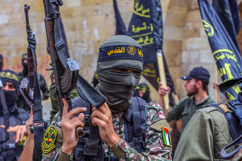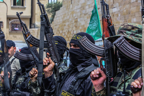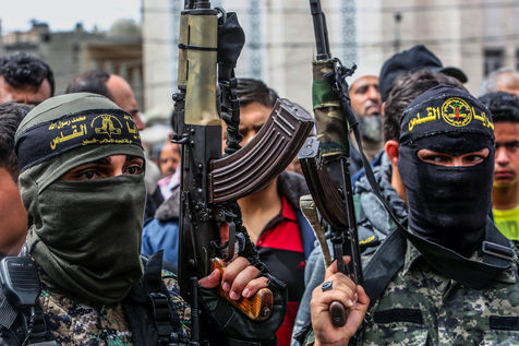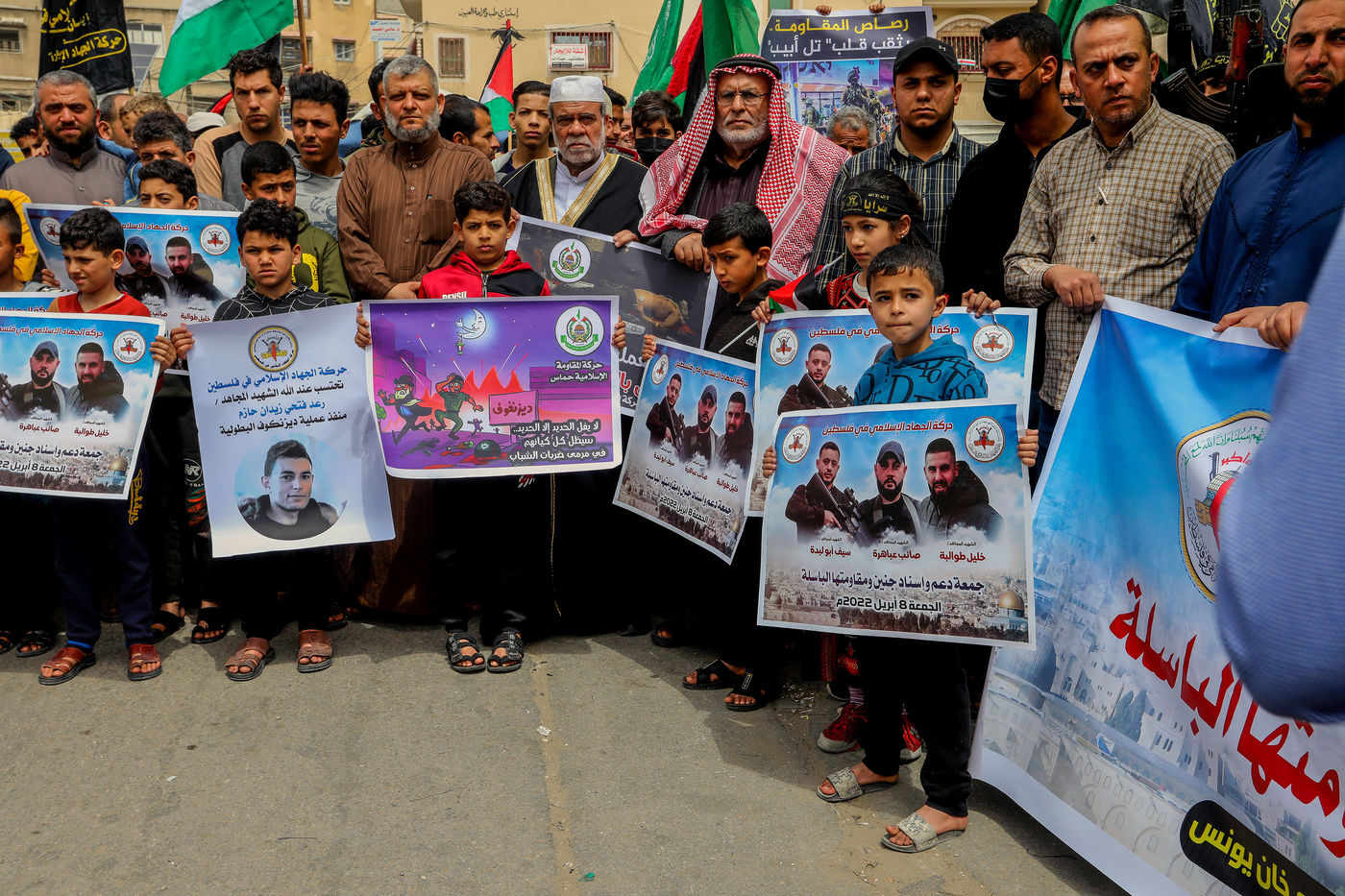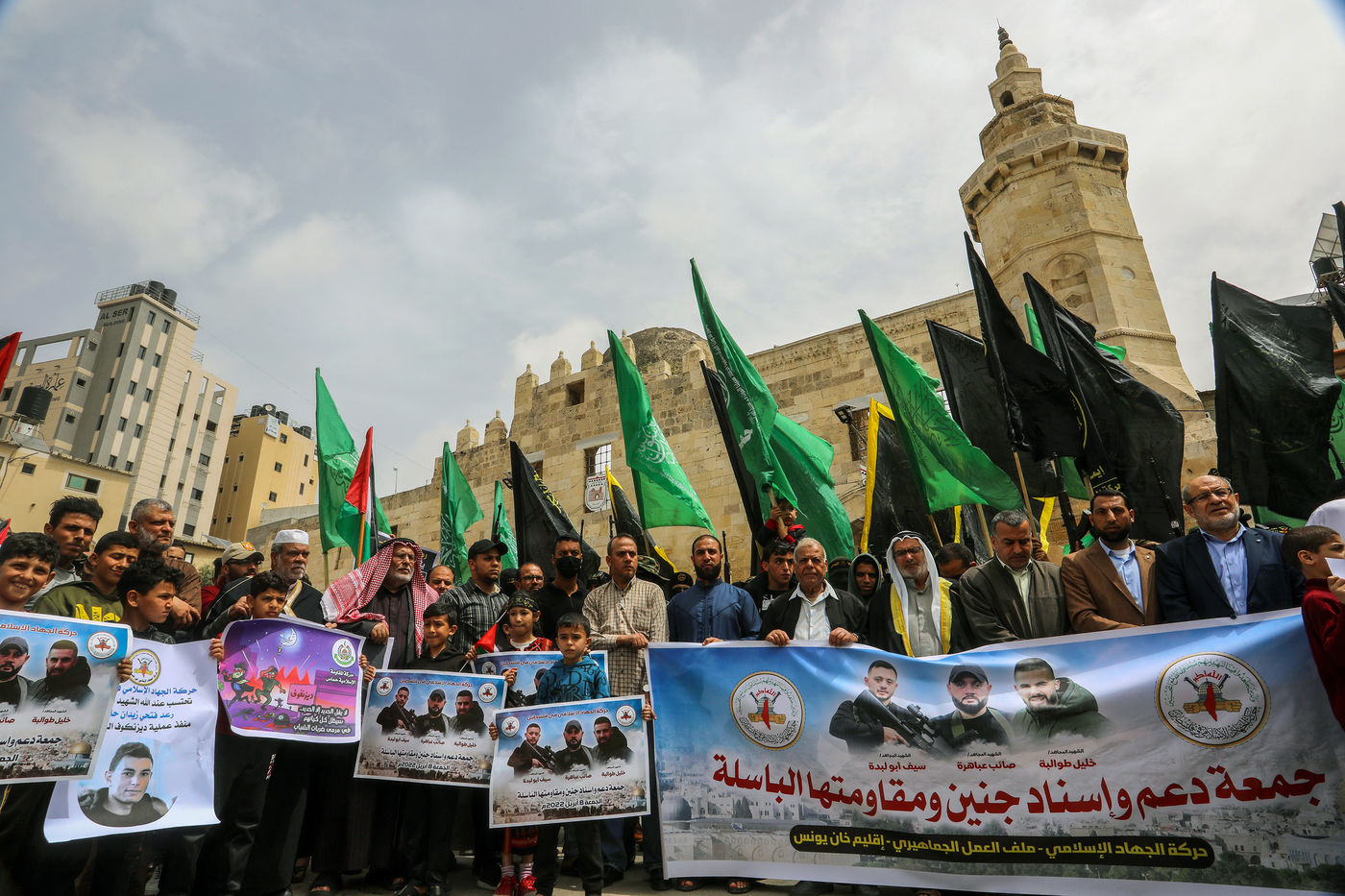 KHAN YOUNES, GAZA STRIP - APRIL 08. Supporters of Hamas and Islamic Jihad take part in a rally to celebrate the shooting attacks in Israel, in the southern Gaza Strip, on April 8, 2022. Palestinians celebrate the shooting attacks in Tel Aviv, Israel.