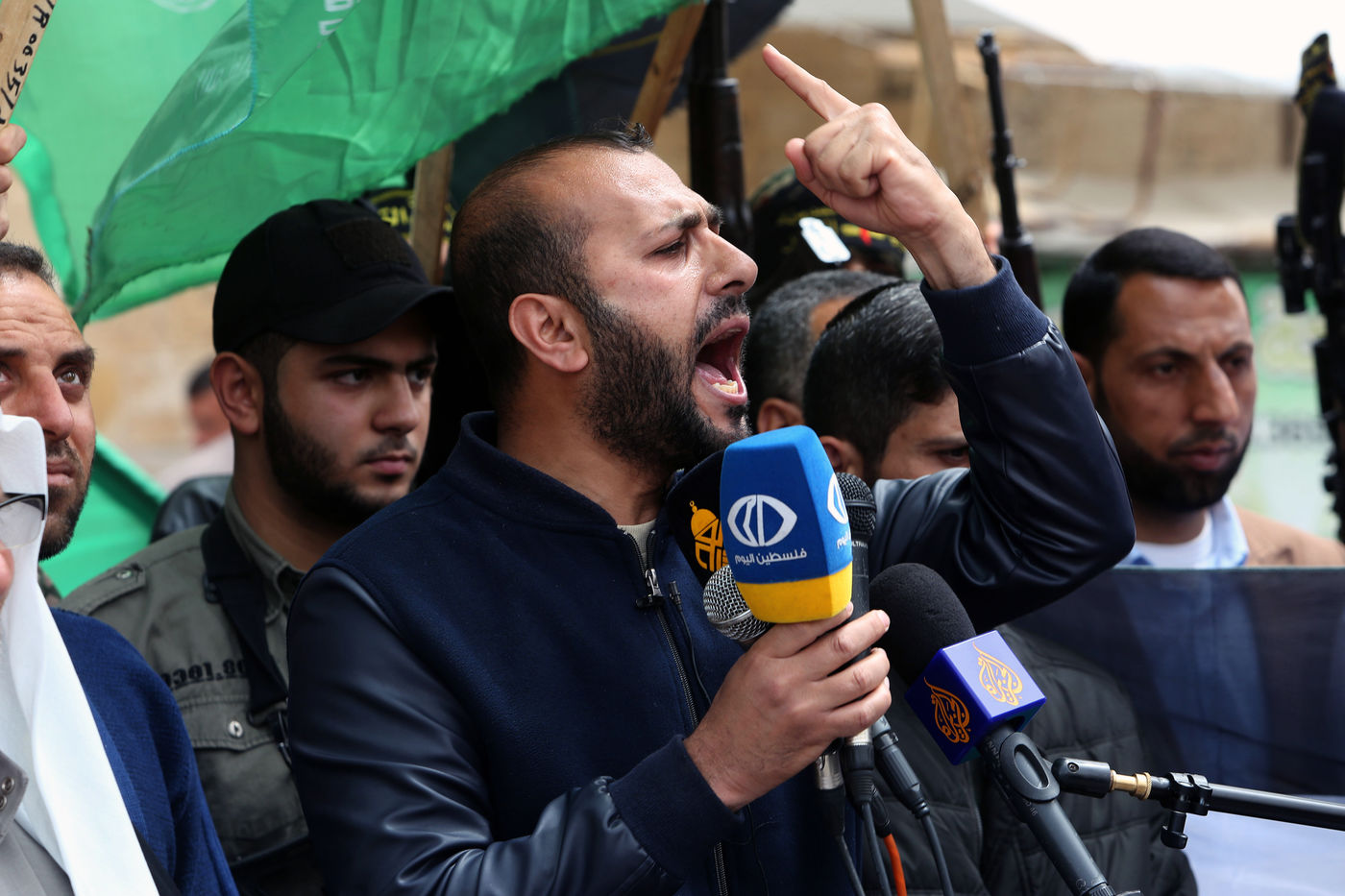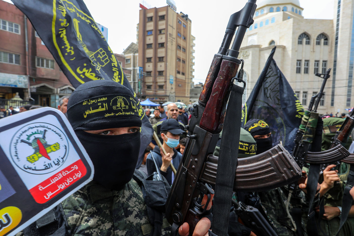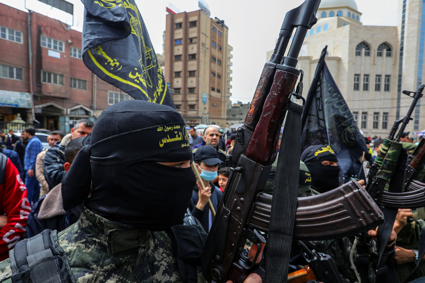 KHAN YOUNES, BANDE DE GAZA - 08 APRIL. Des partisans du Hamas et du Jihad islamique participent à un rassemblement pour célébrer les attaques par balles en Israël, dans le sud de la bande de Gaza, le 8 avril 2022. Des Palestiniens célèbrent les fusillades à Tel Aviv, en Israël.