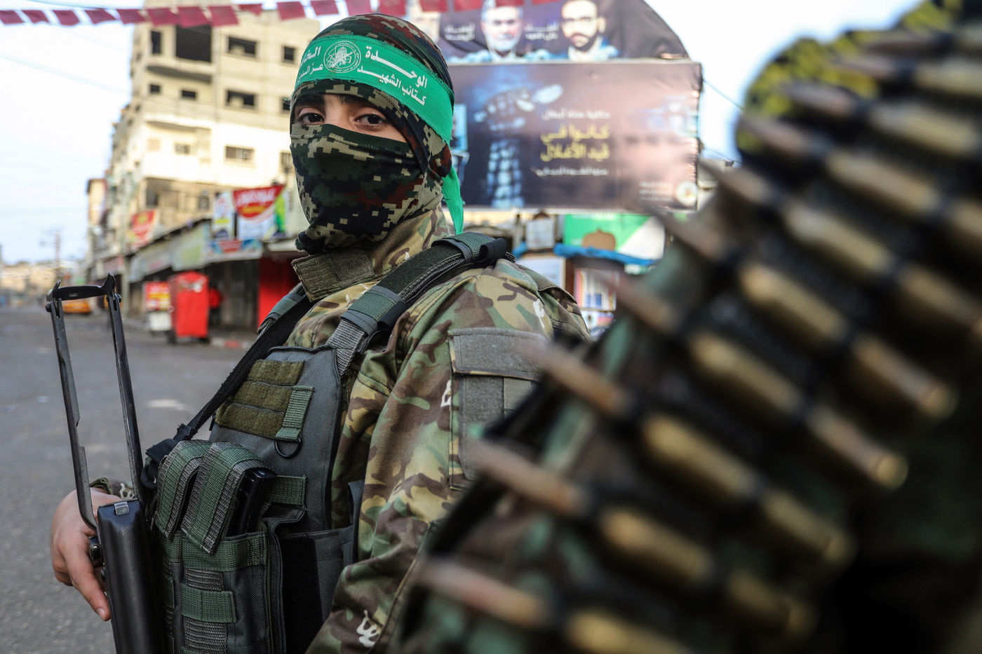 Des membres des Brigades Al-Qassam distribuent des bonbons après la fin de la prière de l'Aïd al-Fitr