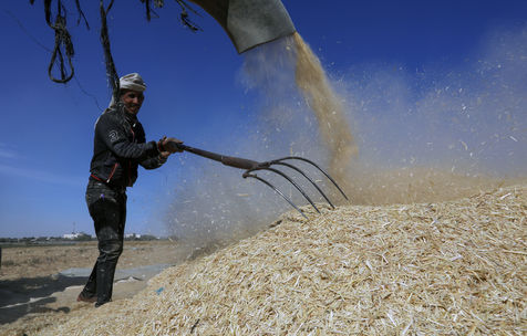 RAFAH, GAZA STRIP - MAY 08. Palestinian farmers harvest wheat during the annual harvest season near the border between Israel and Gaza in Rafah, southern Gaza Strip, on May 8, 2022. Palestinians begin harvesting wheat at the beginning of the season for export.