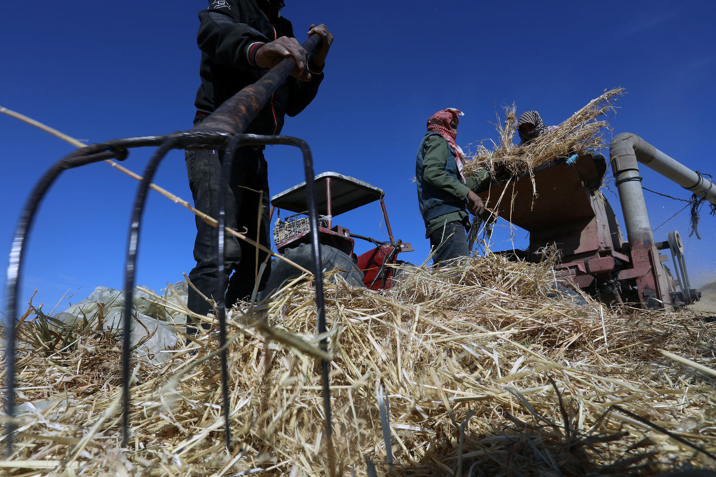 DES AGRICULTEURS PALESTINIENS RÉCOLTENT DU BLÉ PENDANT LA SAISON ANNUELLE DES MOISSONS