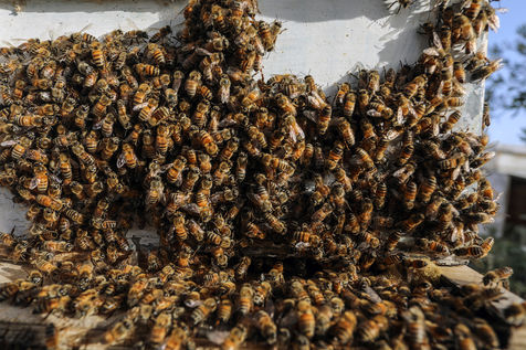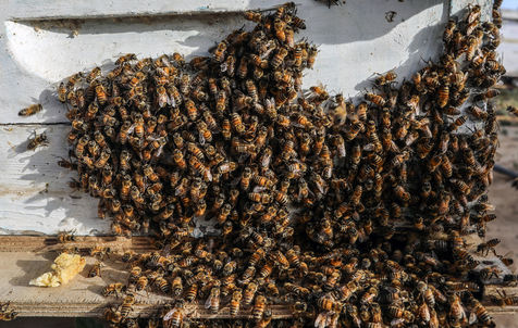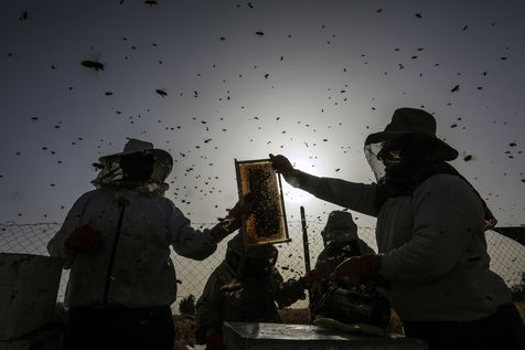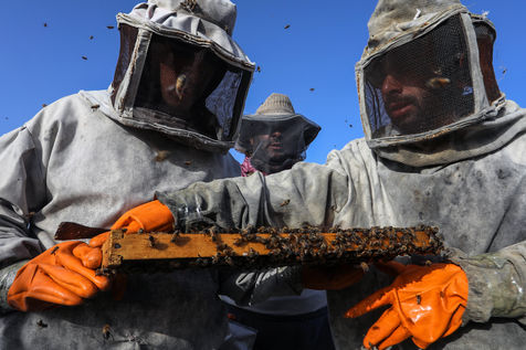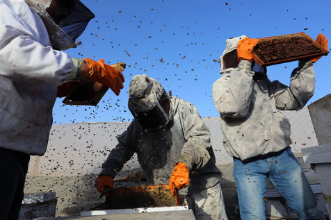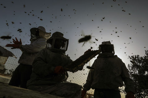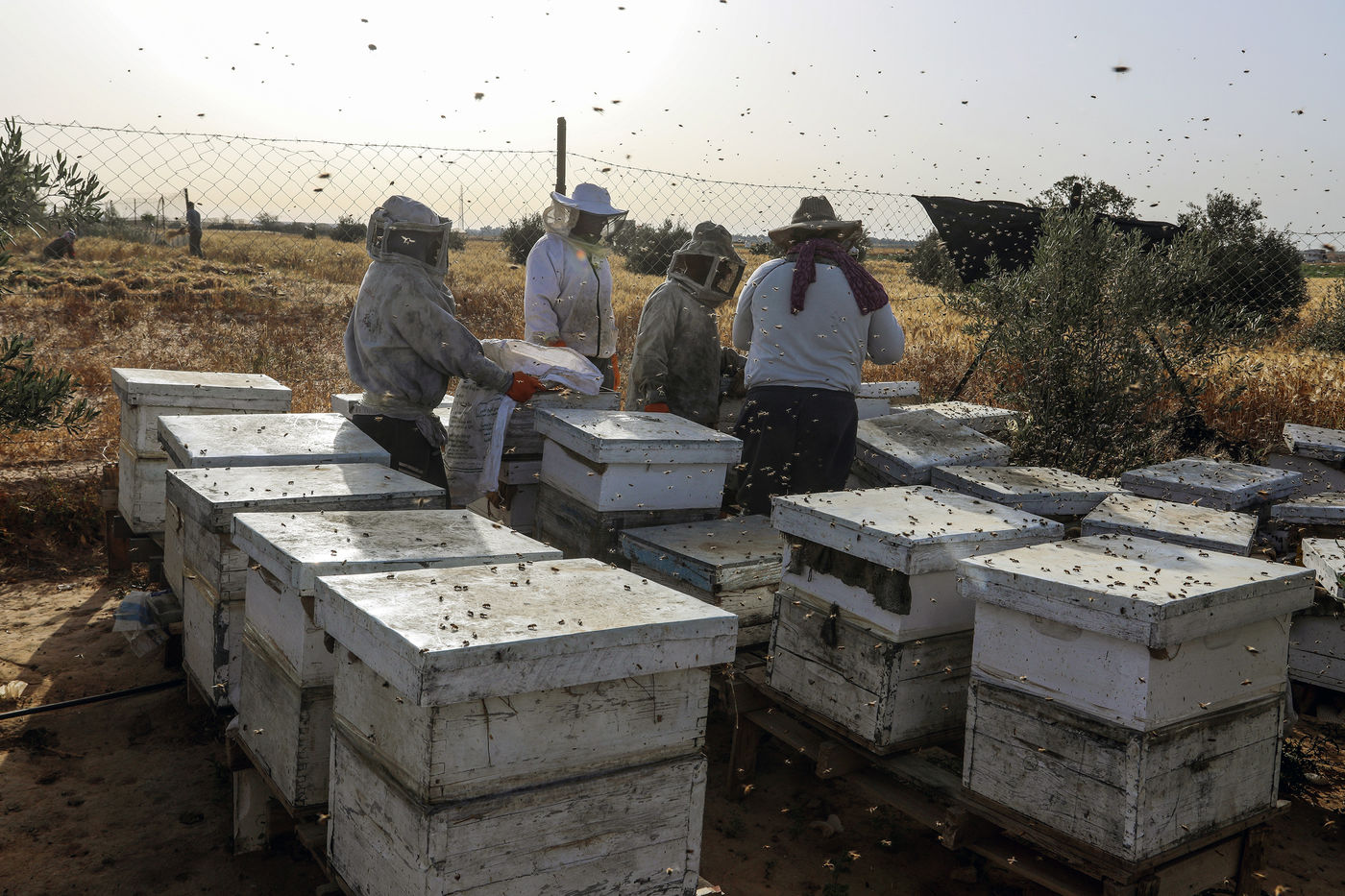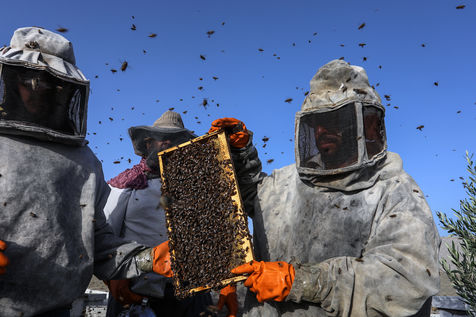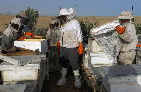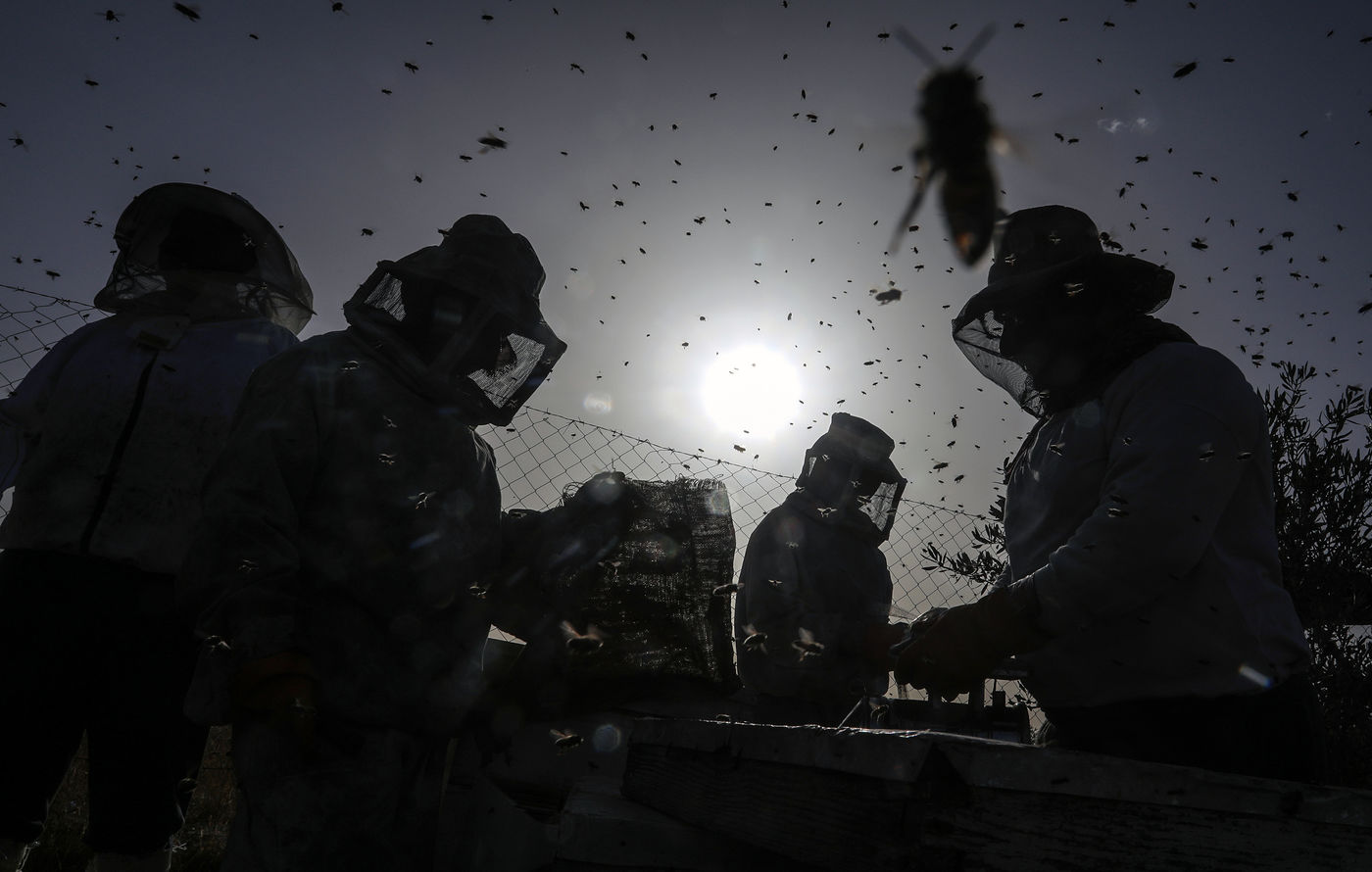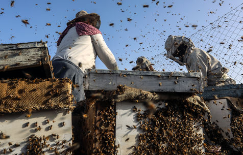 KHAN YUNIS, GAZA STRIP - MAY 09. Palestinian beekeepers collect honey from the beehives of the apiary during the annual harvest season near the Israel-Gaza border in the east of the town of Khan Yunis in the southern Gaza Strip, on May 9, 2022.