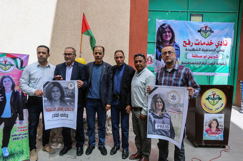 RAFAH, GAZA STRIP - MAY 11. Palestinian journalists take part in a candlelight vigil to denounce the killing of veteran Al-Jazeera journalist Shireen Abu Oqleh, by Israeli forces, in Jenin refugee camp in the West Bank. In the city of Rafah in the southern Gaza Strip, on May 11, 2022.