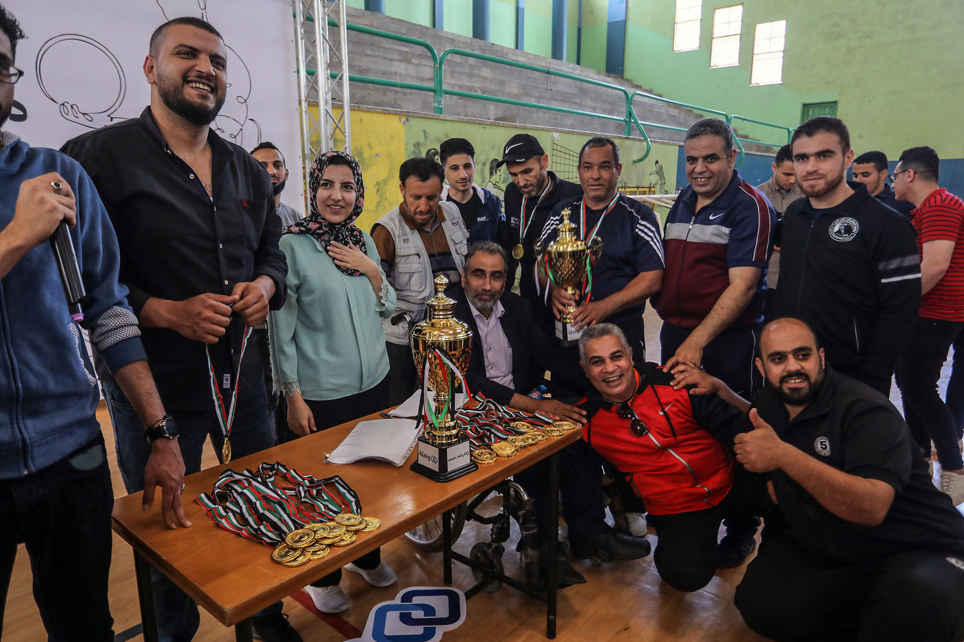 RAFAH, BANDE DE GAZA - 12 MAY. Des Palestiniens organisent un match de "volley-ball assis" pour les personnes à mobilité réduite et amputées au club des services sportifs de Rafah. Dans la ville de Rafah, dans le sud de la bande de Gaza, le 12 mai 2022.