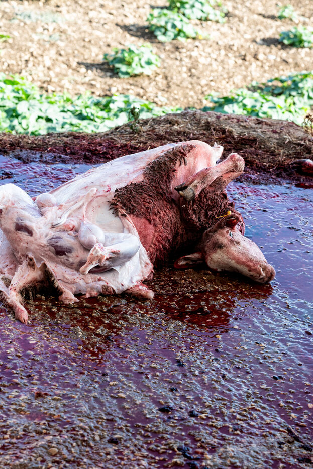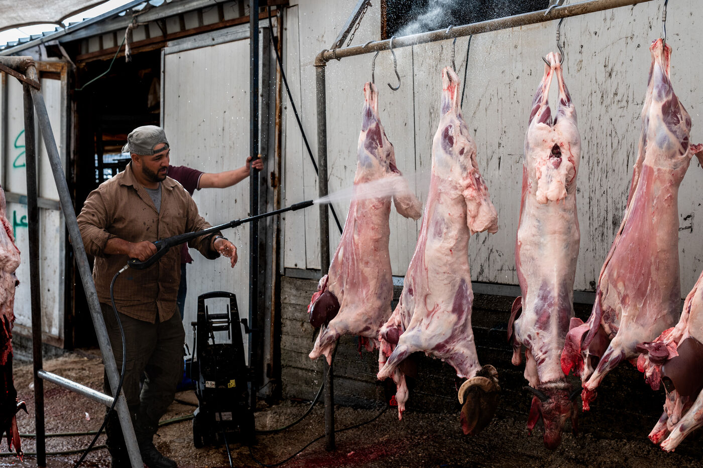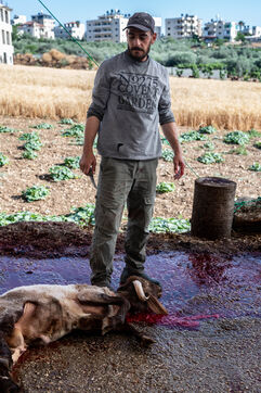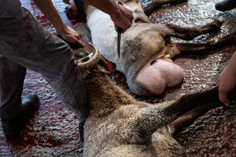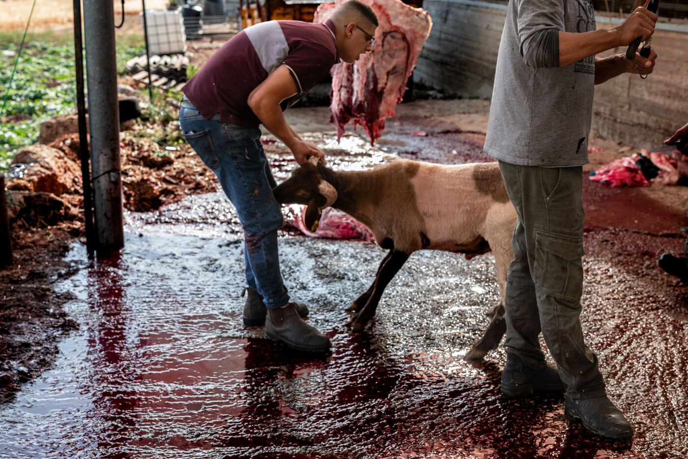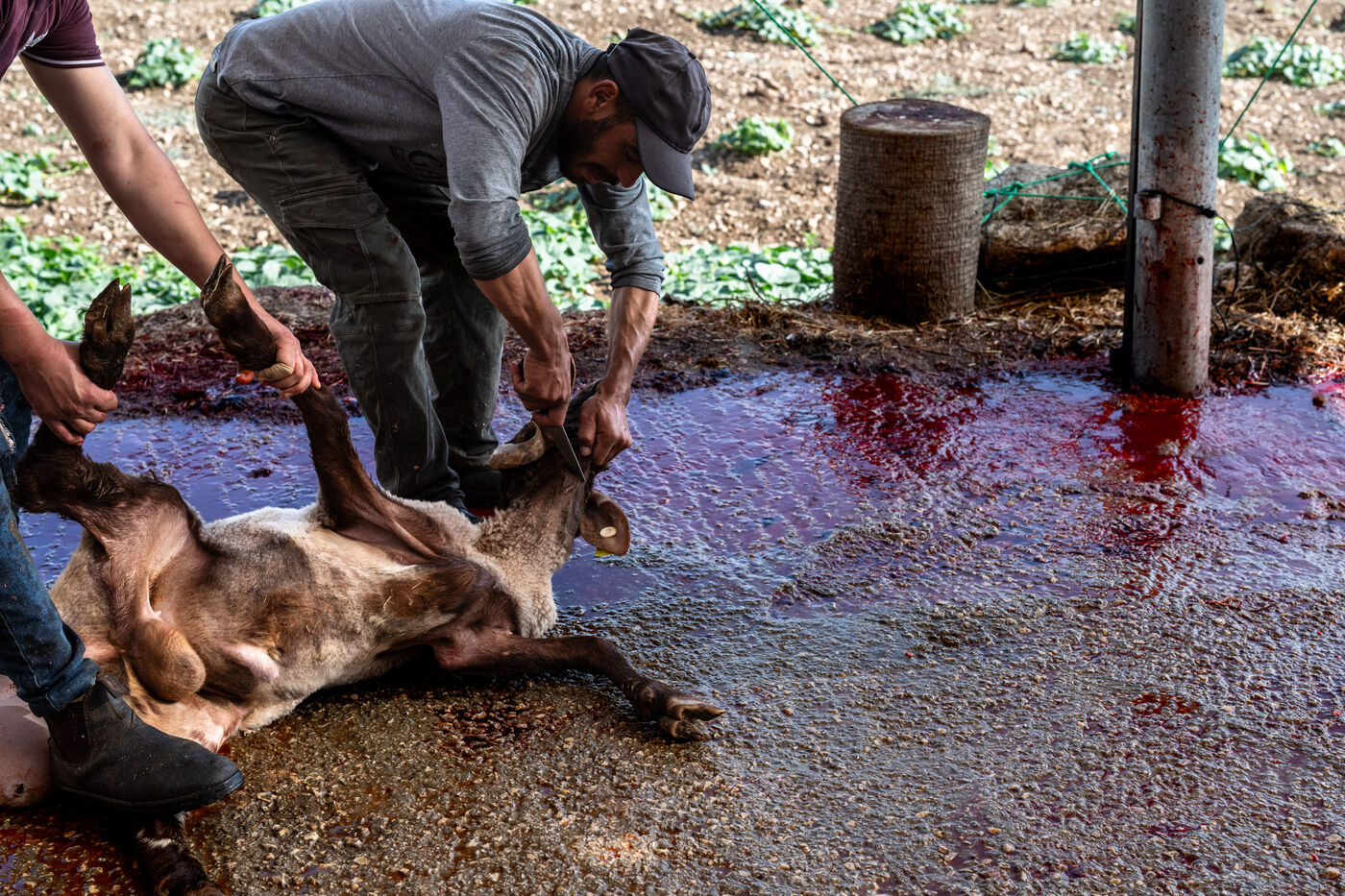Sheep owners who do not wish to perform the sacrifice themselves bring it to the farmer, Jadallah, who will have the slaughter performed while praying to God and ensuring that the sheep do not see the knife.