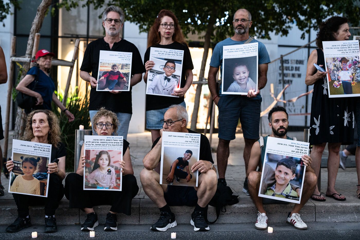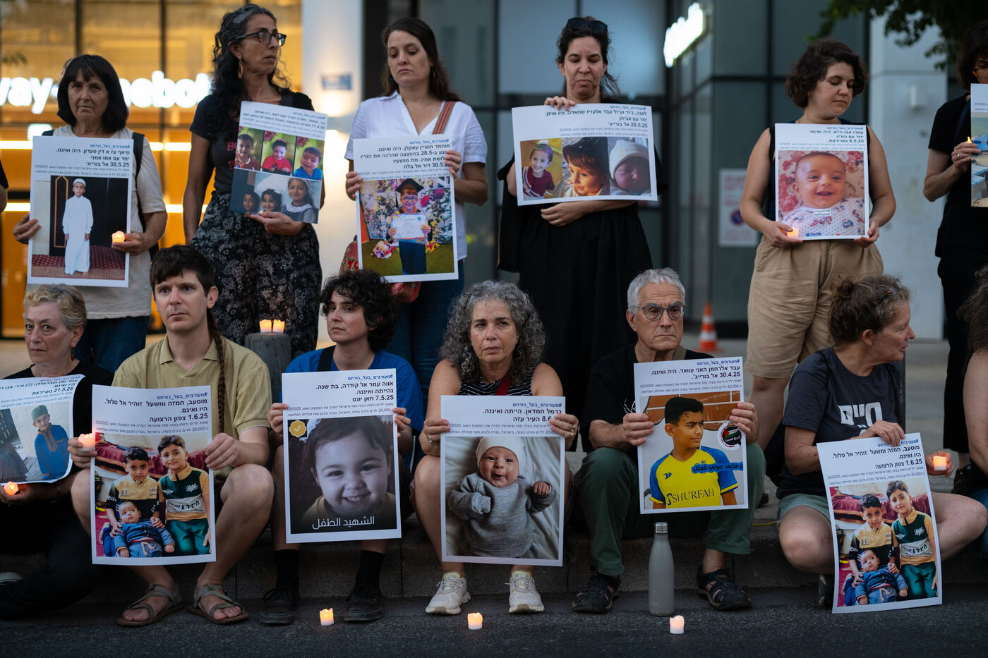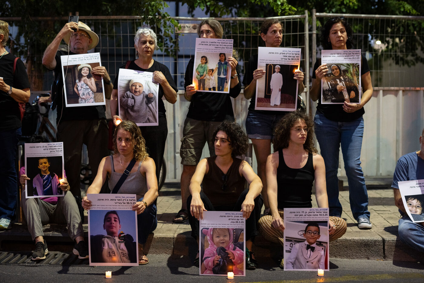 Hundreds of Israelis opposing war stand and sit in the street in a silent and peaceful action, showing photos of Palestinian children from Gaza and the West Bank killed since Israel broke the ceasefire in March 2025, as new ceasefire negotiations are in progress. The vigil took place between Hostages Square and Begin Gate in Tel Aviv—symbolic sites of rallies calling for the release of Israeli hostages held by Hamas in Gaza—creating a space for acknowledging and raising awareness of the reality faced by Palestinians, for exchange, discussion, and sometimes silent confrontation.