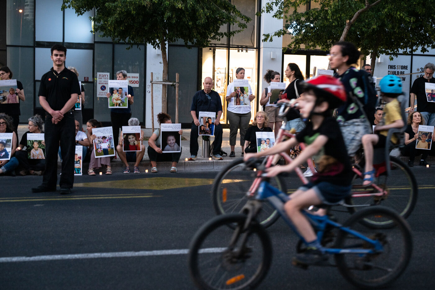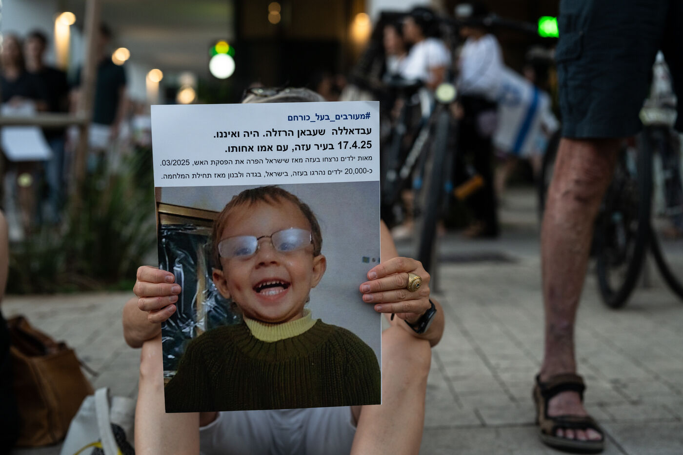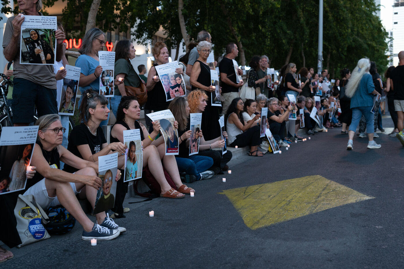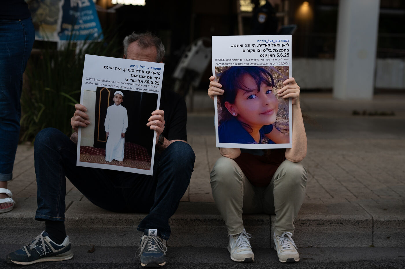 Hundreds of Israelis opposing war stand and sit in the street in a silent and peaceful action, showing photos of Palestinian children from Gaza and the West Bank killed since Israel broke the ceasefire in March 2025, as new ceasefire negotiations are in progress. The vigil took place between Hostages Square and Begin Gate in Tel Aviv—symbolic sites of rallies calling for the release of Israeli hostages held by Hamas in Gaza—creating a space for acknowledging and raising awareness of the reality faced by Palestinians, for exchange, discussion, and sometimes silent confrontation.