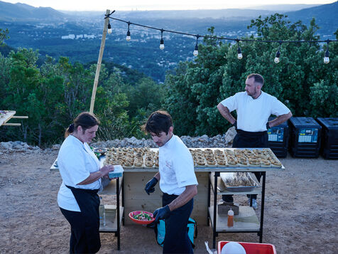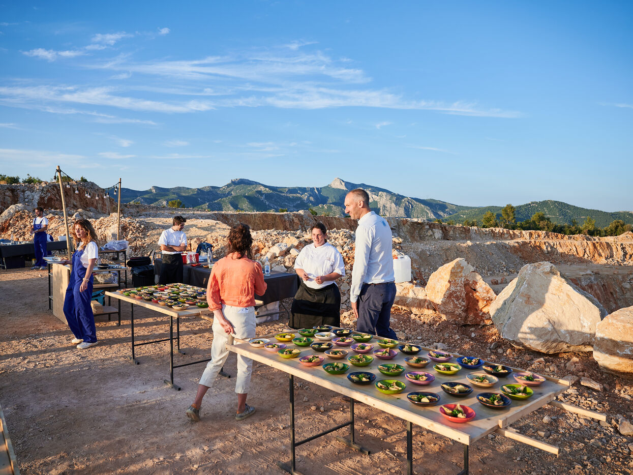 The photoreport focuses on the preparation of the event ‘Dîners Insolites*’ (“Unusual Dinners”), which took place on 9 July 2024 at the Bronzo quarries in the heart of the Escargot valley (Aubagne), and which enabled 3 inmates to get out until one in the morning, living an extraordinary professional experience, supervised by chef Sandrine Sollier.