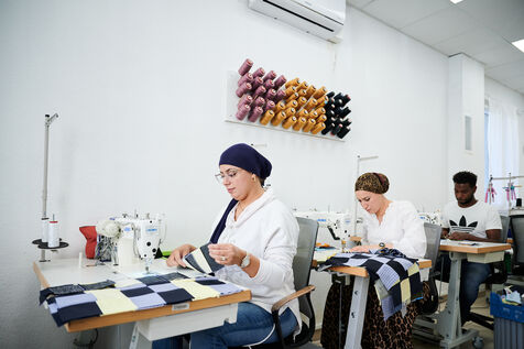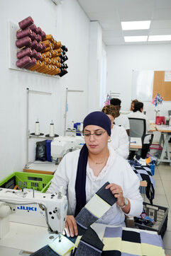 Ministerial visit by Marie-Agnès Poussier-Winsback, Minister for the Social and Solidarity Economy, to the 13 ATYPIK sewing workshops in Marseille. 13 ATIPIK is a textile workshop where sewing valorizes used fabrics to transform them into clothing or accessories, and employs 35 people in social integration.
