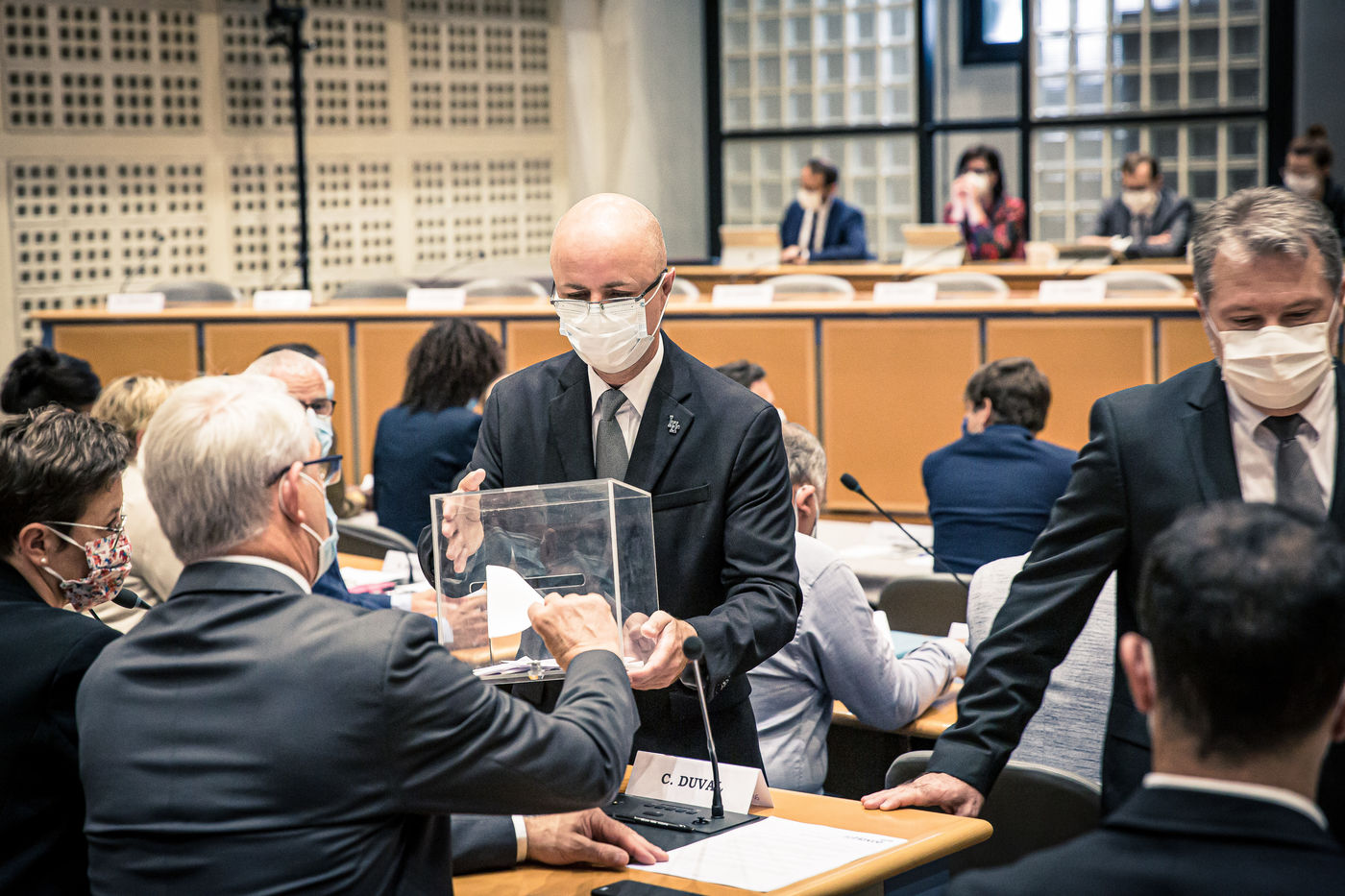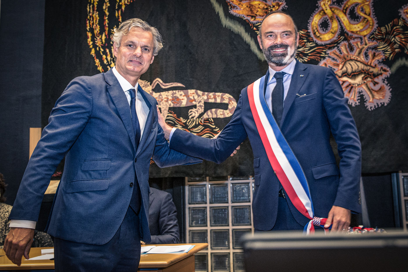 Edouard Philippe au conseil municipal, le Havre 2020. Echange des écharpes lors du conseil municipal Edouard philippe devient maire du Havre à nouveau.