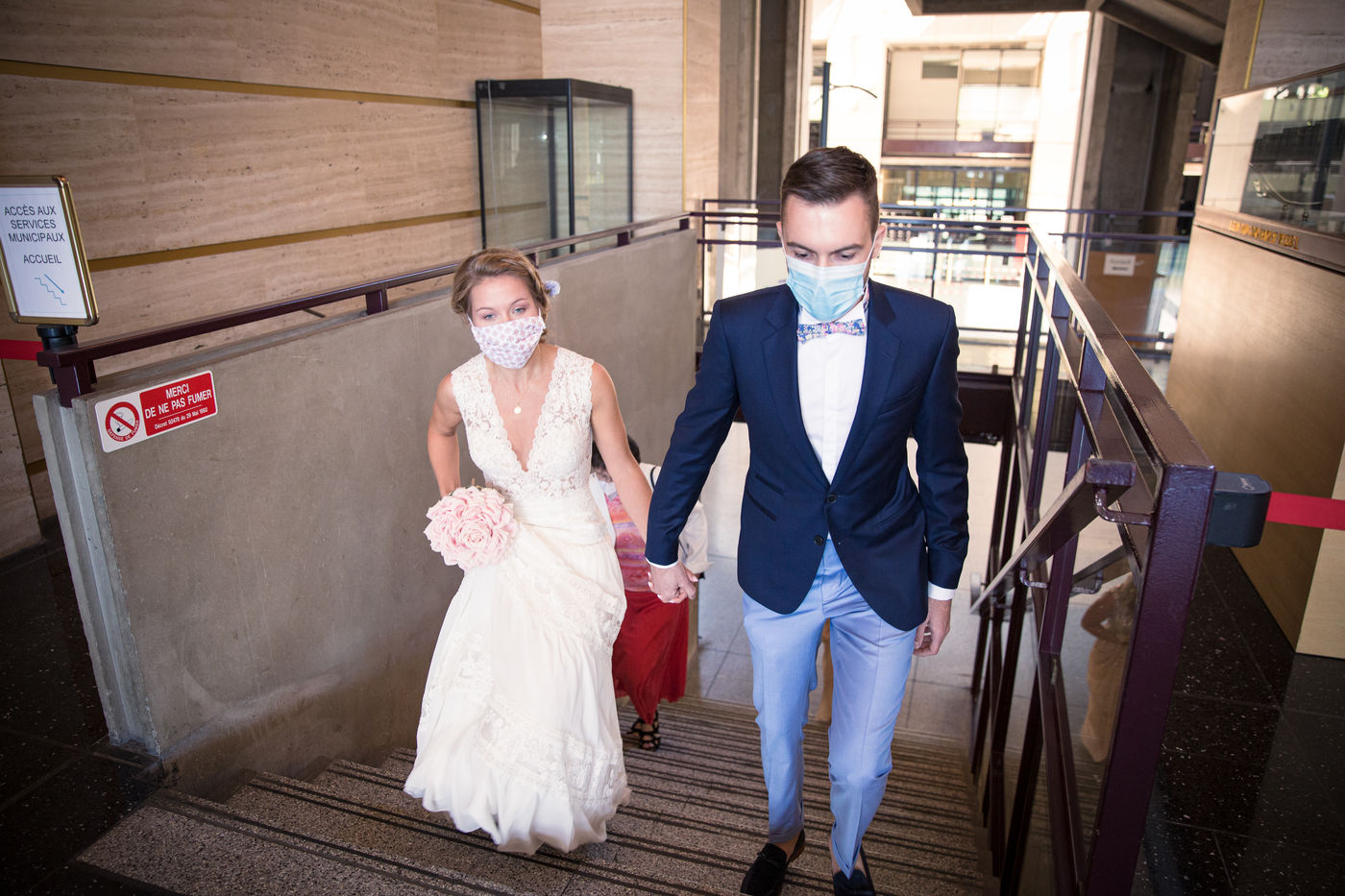 A la sortie du confinement, en mai 2020, un jeune couple normand décide de maintenir leur mariage et célèbre cette union malgré l'imposition des règles sanitaires anti-covid, masque et distanciation sociale à la mairie du Havre.