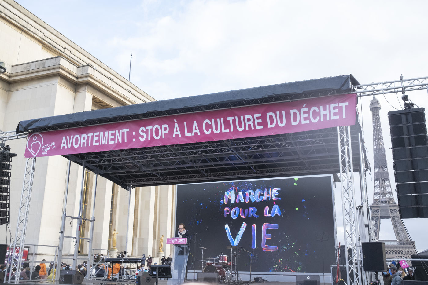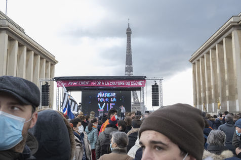 Dimanche 17 Janvier plusieurs milliers de personnes se sont rassemblées place du Trocadéro face à la Tour Eiffel à Paris, contre le projet de loi visant à rallonger la durée légale pour un possible IVG, avortement. Les pro-vies se sont donc rassemblés avec leurs masques de protection contre le Coronavirus, et une visioconférence zoom a aussi été organisée et retransmit sur écran géant.