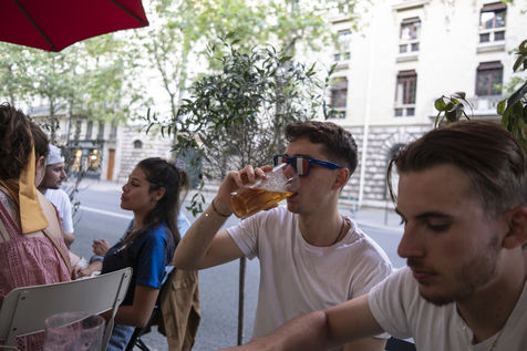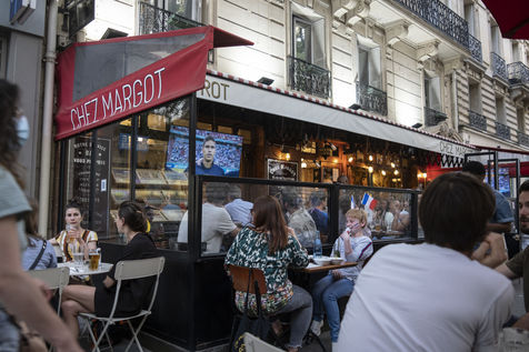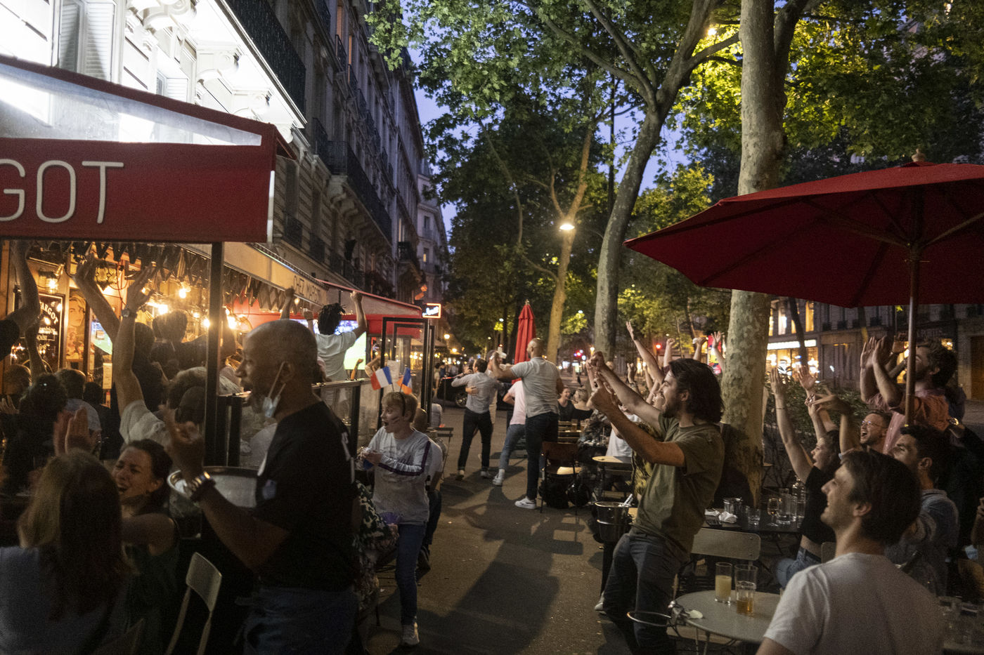 Illustrations in some pictures of the atmosphere that reigned in the streets of the capital for this first match of the French soccer team for Euro 2020. Here on the terrace full of a bar, which retransmitted the match on two screens, in Paris, June 15, 2021.