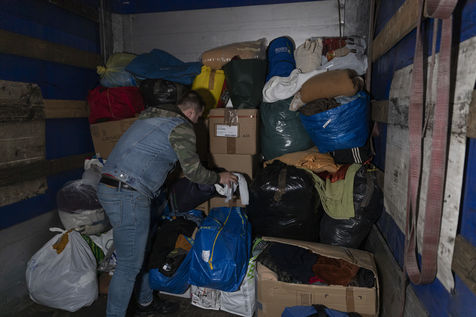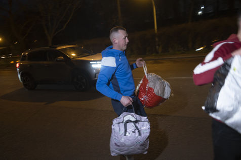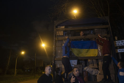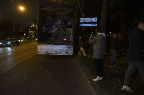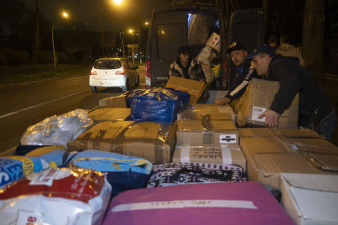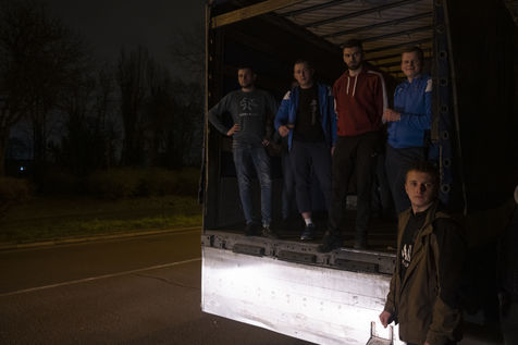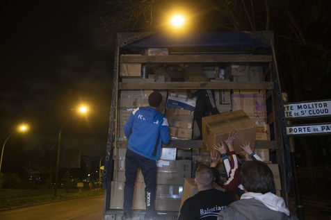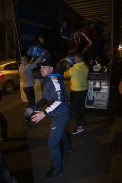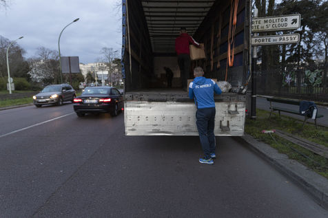 Cette salle va aussi leur servir de dépôt pour regrouper et centraliser tous les dons reçus à travers la France. Car aujourd'hui le camion envoyé par la diaspora est un peu plus gros que d'habitude. Effectivement c'est un vingt-quatre tonnes qui les attends sur les abords du périphérique parisien car trop volumineux pour rentrer dans la ville. Pendant près de deux heures la trentaine de jeunes présents charge ce camion, carton par carton en faisant une chaîne humaine. Tellement les dons ont afflué ces derniers jours, certains auront du mal à rentrer dans l'immense remorque. Mikhaylo à même du refuser deux camionnettes de 18m3 qui devait encore arriver de province. Mais ce n'est que partie remise pour un futur départ.
