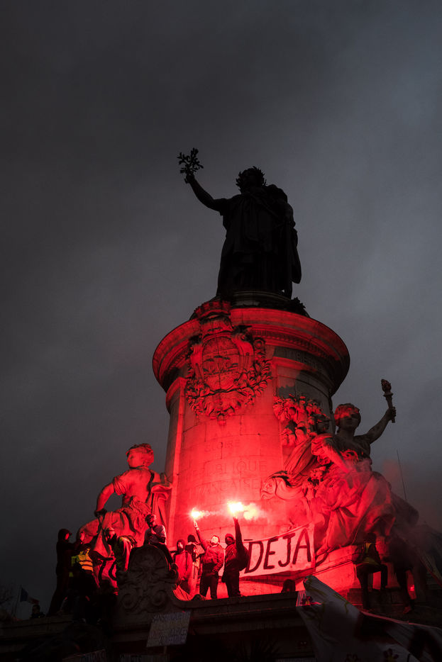 Acte IV des gilets jaunes à Paris, le samedi 8 décembre 2018. A la fin de la journée 1380 personnes avaient été interpellées sur l'ensemble du territoire, dont 1.150 rien qu'à Paris. Pour l'ensemble du territoire, 89.000 membres des forces de l'ordre sont mobilisés, dont 8.000 à Paris appuyés par 14 "VBRG", véhicules blindés à roue de la gendarmerie déployés pour la première fois de leur histoire dans la capitale.