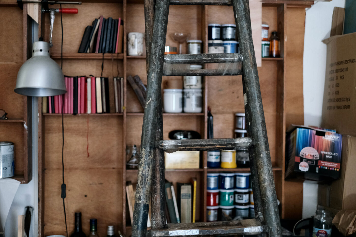 In the middle, in the soft light of the early afternoon, a table covered in traces of paint, ready for research. Or a coffee.