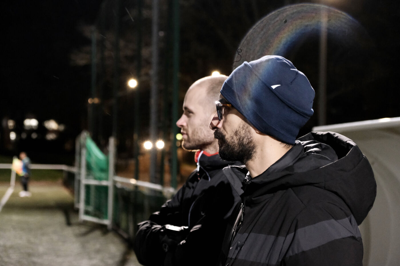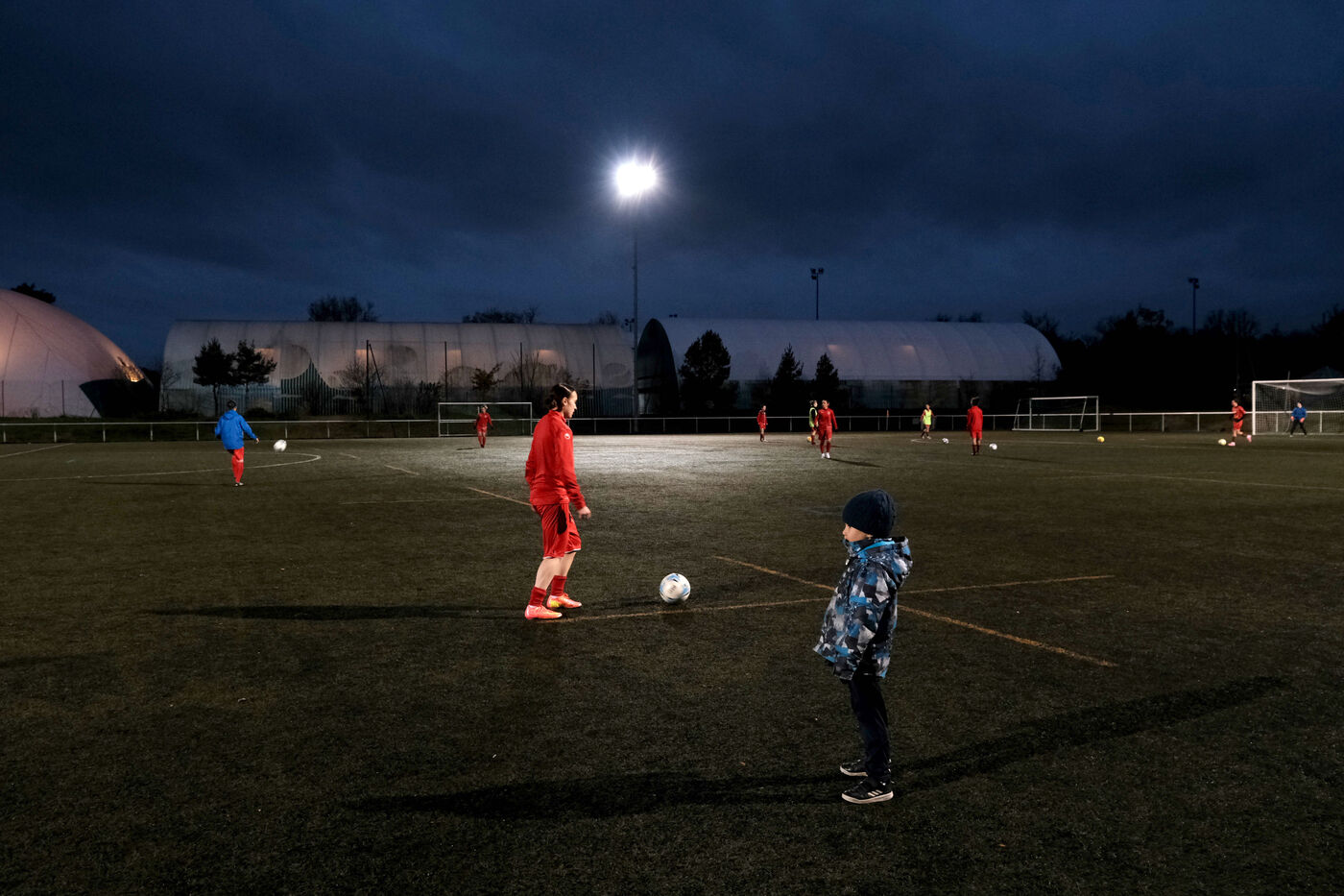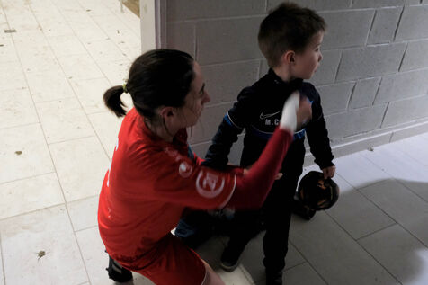 Avant le jeu, entre les mi-temps, elle vérifie qu'il n'a pas faim, pas froid, pas sommeil. Elle l'attrape, l'embrasse, joue avec lui.